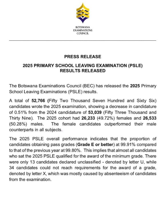 “The proportion of candidates who obtained credits grades C or better improved by 0.80, from 73.30% in 2024 to 74.10% this year,” reads a statement from the Botswana Examinations Council.
