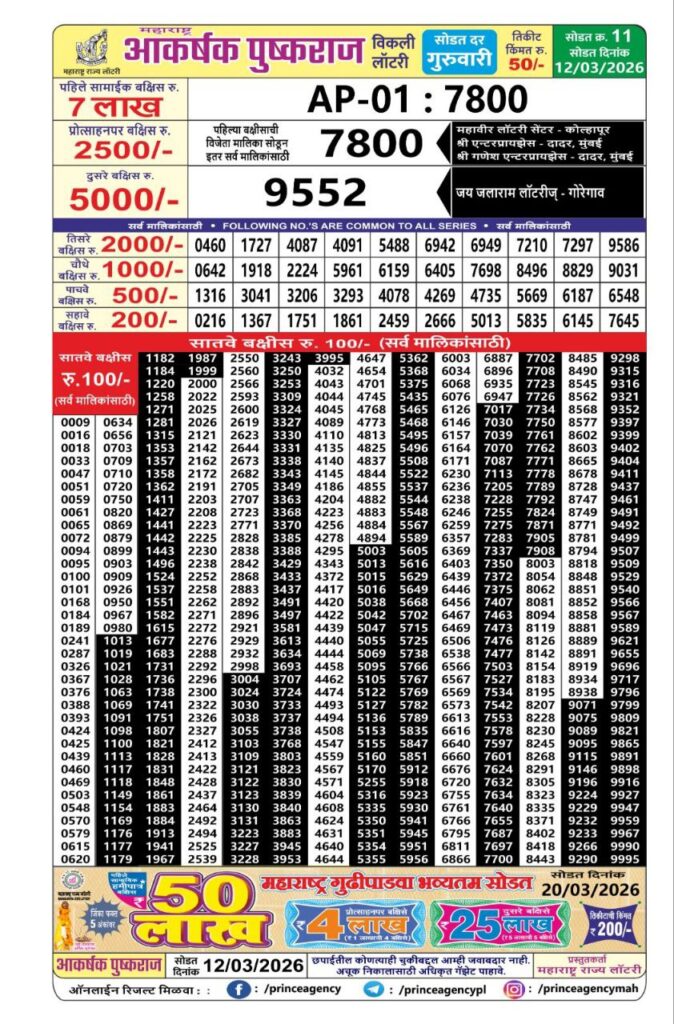 Maharashtra State Lotteries Recently published Akarshak Pushkraj Draw Results March 2025. all the Prize-Winning Numbers available On this site. Therefore the State Government has brought this Lottery to Existence so that the Common man Does not fall prey to Duplicate lottery tickets. Because a large Number of Lottery Participants try their luck to take home a large Amounts Rs.7 lakh/- this lottery. To View your Akarshak Lottery Result Every Thursday at 4.15 PM.