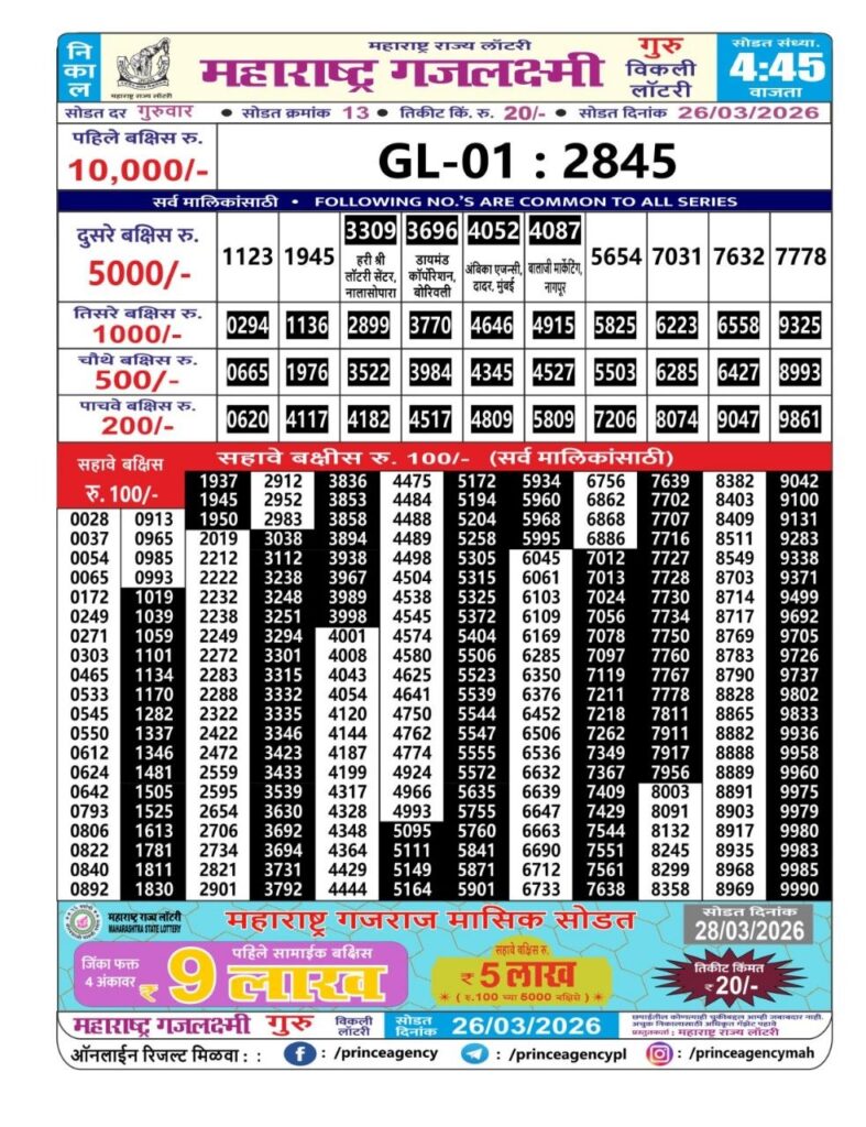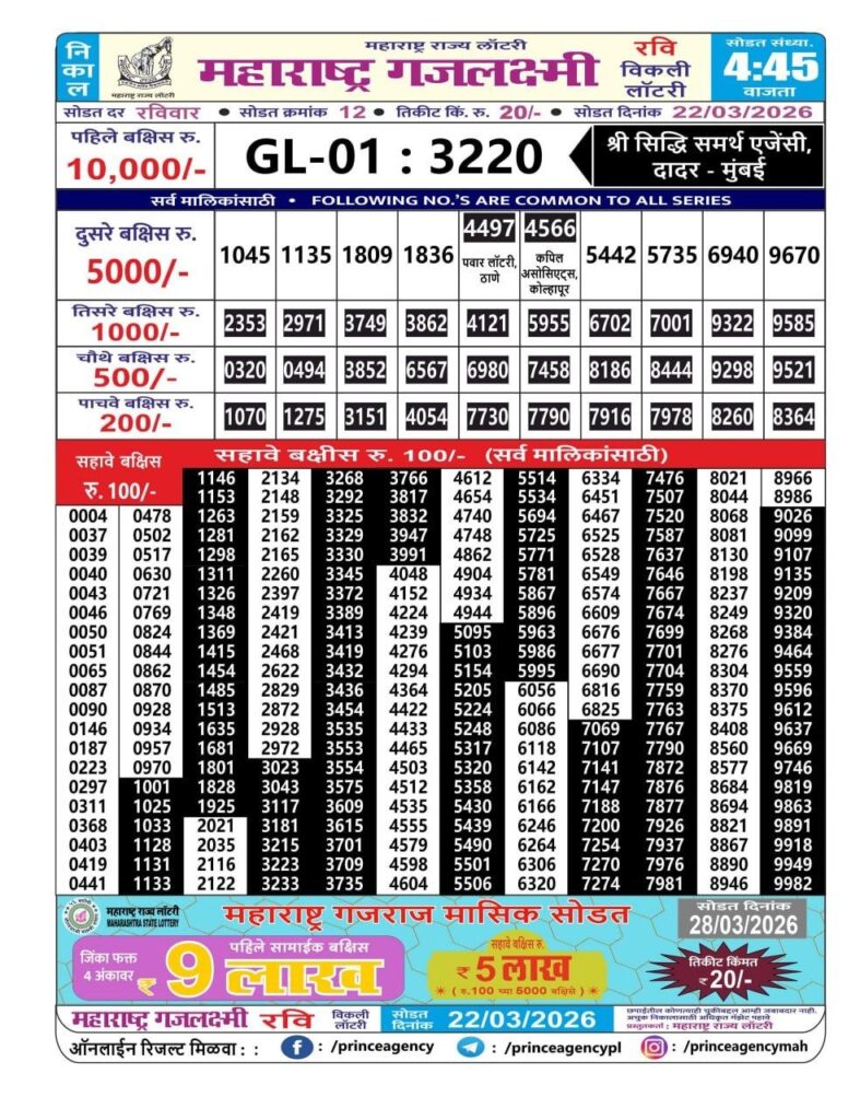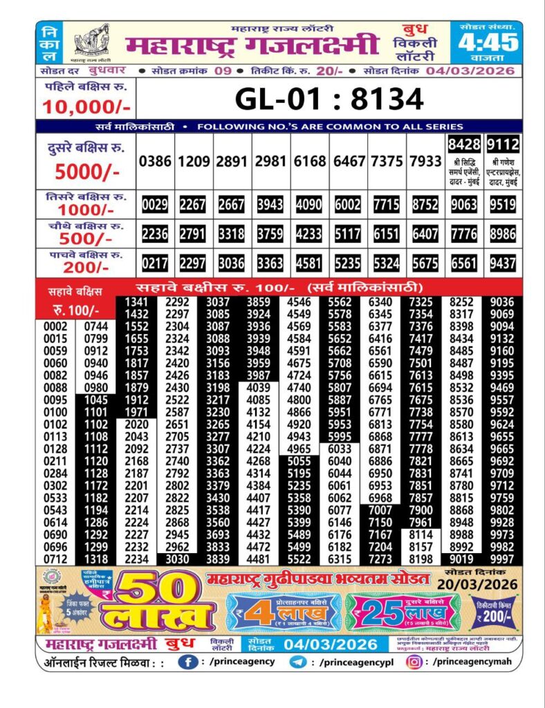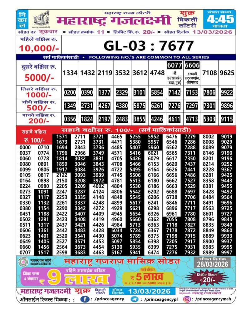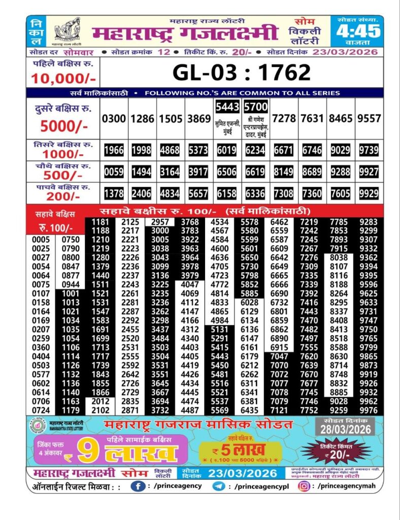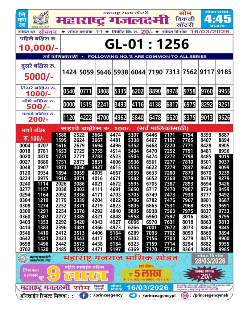 If the the goal is clear, then making its way through the Maharashtra State Gajlaxmi Lottery Today result would be the Right option. You hold the key to Your Bright Future, and Lottery Draws are the Kinks. Directorate of Maharashtra Rajya Lotteries continues to announce the Gajlaxmi Weekly Lottery 2026 results at 04:45 PM. A large number of Lottery Opponents Believed Lotteries from Different Lottery Centers. The State Government started the Lottery to encourage people to participate and earn Extra Cash. So, with Constant Encouragement and cheap lottery tickets, more and more people are trying their luck in Maharashtra State Lotteries.