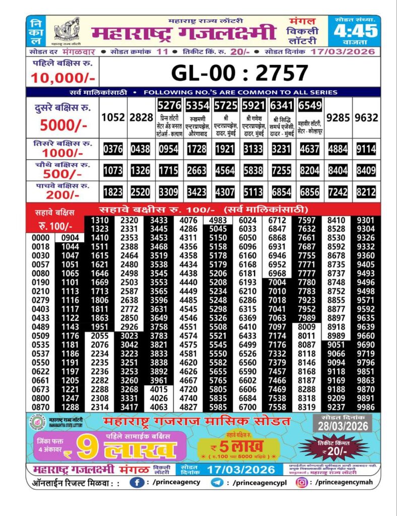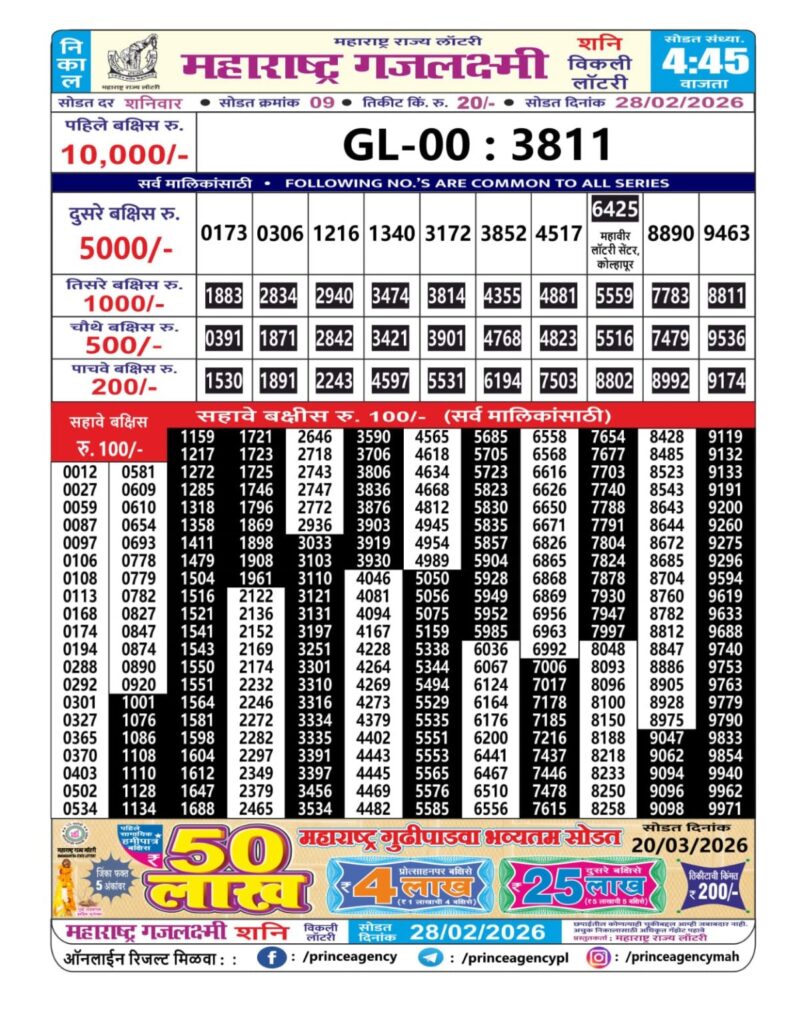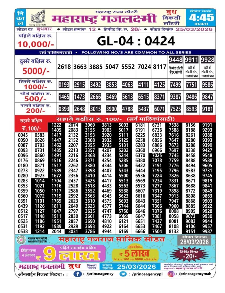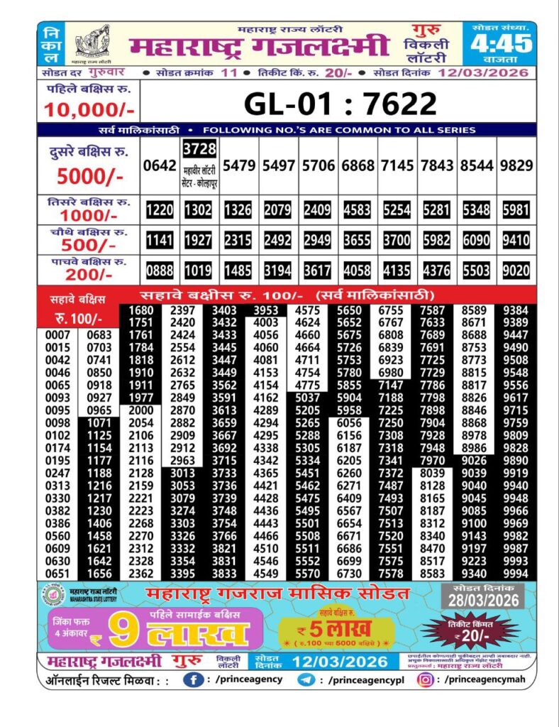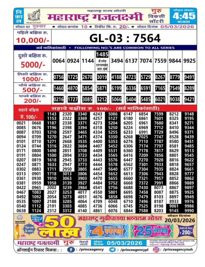 If the the goal is clear, then making its way through the Maharashtra State Gajlaxmi Lottery Today result would be the Right option. You hold the key to Your Bright Future, and Lottery Draws are the Kinks. Directorate of Maharashtra Rajya Lotteries continues to announce the Gajlaxmi Weekly Lottery 2026 results at 04:45 PM. A large number of Lottery Opponents Believed Lotteries from Different Lottery Centers. The State Government started the Lottery to encourage people to participate and earn Extra Cash. So, with Constant Encouragement and cheap lottery tickets, more and more people are trying their luck in Maharashtra State Lotteries.