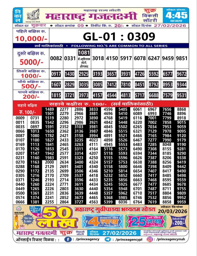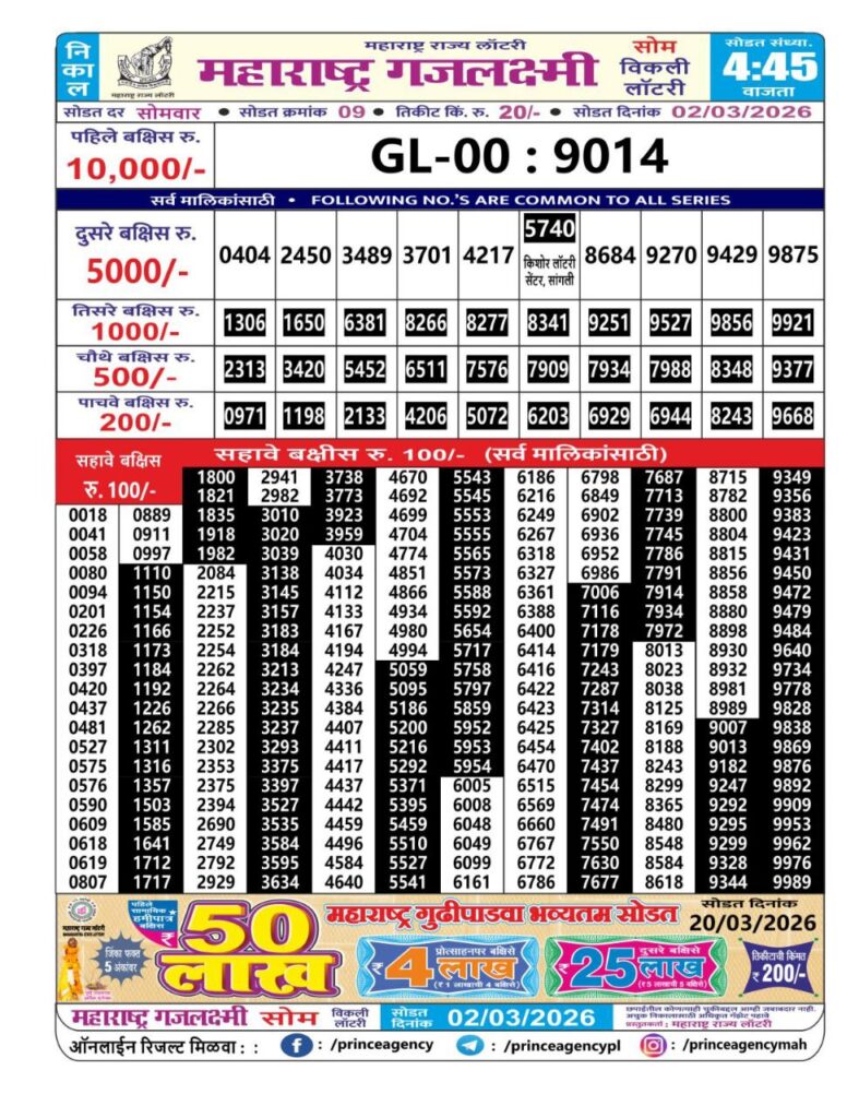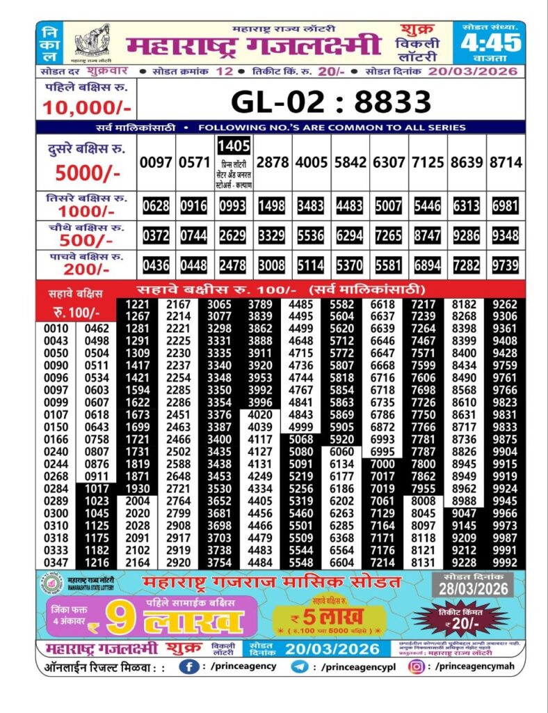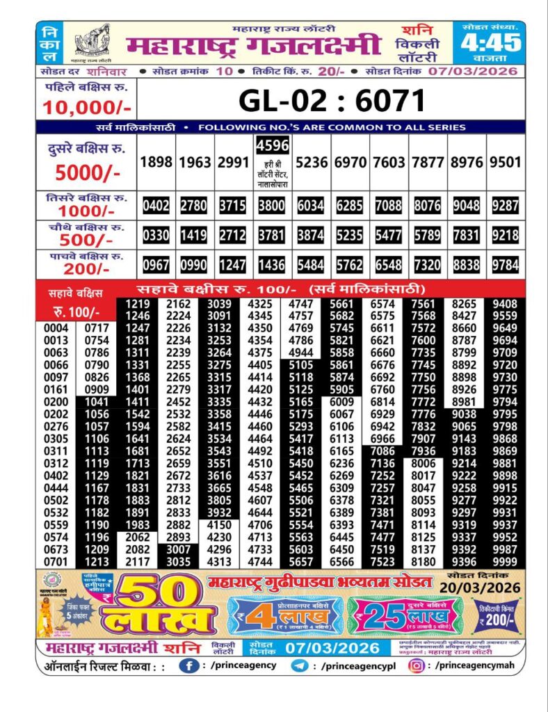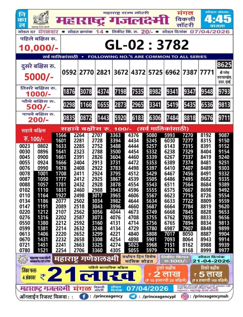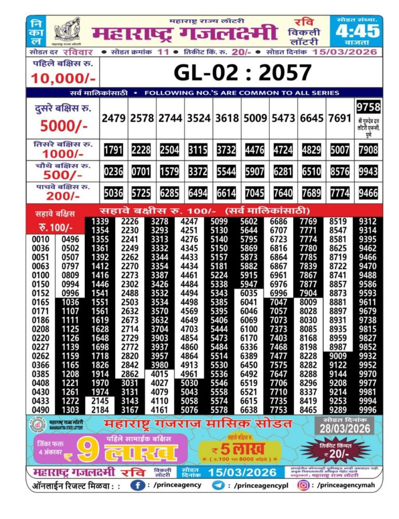 If the the goal is clear, then making its way through the Maharashtra State Gajlaxmi Lottery Today result would be the Right option. You hold the key to Your Bright Future, and Lottery Draws are the Kinks. Directorate of Maharashtra Rajya Lotteries continues to announce the Gajlaxmi Weekly Lottery 2026 results at 04:45 PM. A large number of Lottery Opponents Believed Lotteries from Different Lottery Centers. The State Government started the Lottery to encourage people to participate and earn Extra Cash. So, with Constant Encouragement and cheap lottery tickets, more and more people are trying their luck in Maharashtra State Lotteries.