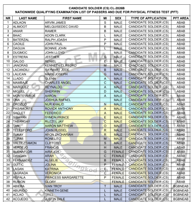 Congratulations to the successful candidates, Soldier (CS) and Special Enlistment (SE) applicants who have qualified the nationwide airment qualifying exam (AQE) and Licenses Criminologist who submitted their complete supporting documents from 28 April 2025 to 30 June 2025. Aspirants informed that you are scheduled to undergo a Physical Fitness Test (PFT) at the designated PAF major base for your probable inclusion to the BMT Class 2026 bravo and Special Enlistment CY 2026.