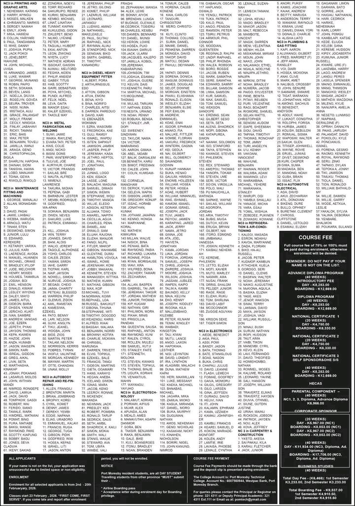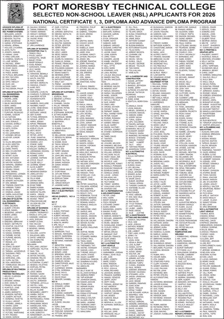 Port Moresby Technical Colleges Non-school Leavers Selection List 2026 Details