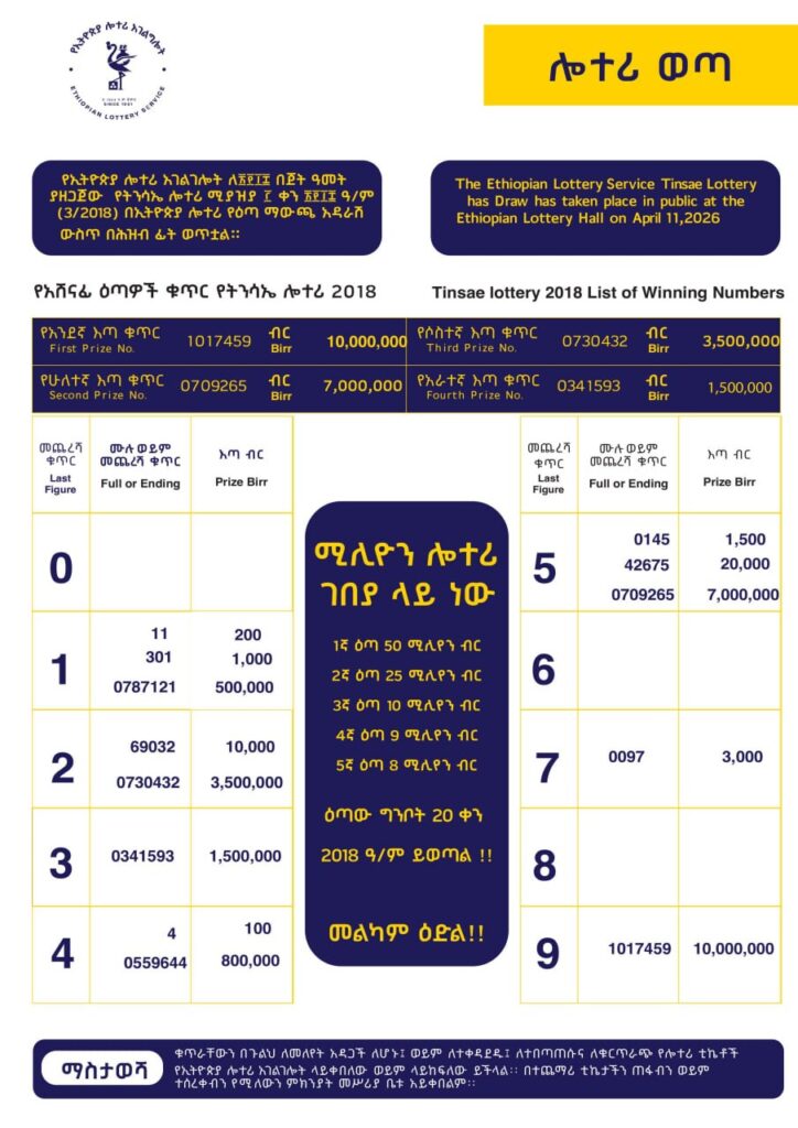 Spark up your motivation and keep trying in the Ethiopian National Lotteries. Get ready to check yet another jackpot draw from the Ethiopian National Lottery Administration. ትንሳኤ ሎተሪ ውጤት ሚያዚያ 03, 2018 Tinsae Lottry Results On Saturday, 11 April 2026. The Participants made the right choice of choosing this article to know the Ethiopian Tinsae Lottery Draw Results 11-04-2026. Life without money is very difficult, and this is the story of every home’s needs. Be the first one to know the ትንሳኤ ሎተሪ ውጤት 2018 Today. Patiently wait for the results while you keep trying your Luck in lotteries and your luck will get you the Fortune