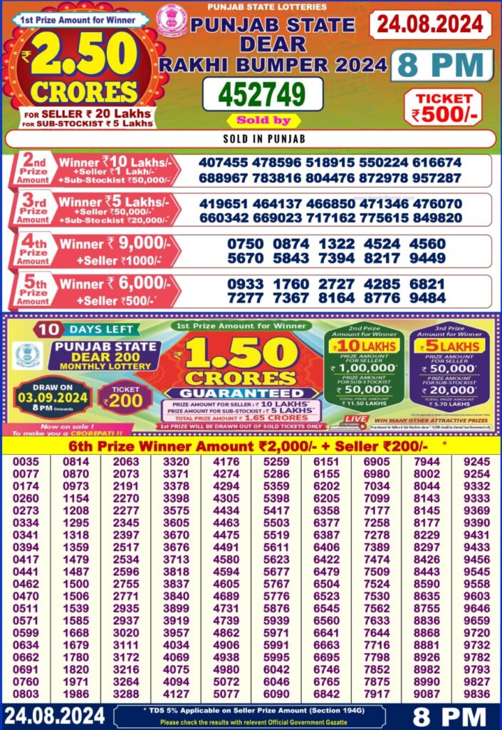 ਪੰਜਾਬ ਪਿਆਰੀ ਰਾਖੀ ਬੰਪਰ ਲਾਟਰੀ ਦਾ ਨਤੀਜਾ 2025. Participating in Punjab State Lottery Result is simple where you enter a chance to win a jackpot worth Rs.2.50 Crore. This is the most exiciting lottery draw that is totally based on your luck. as they say, luck favours those who believe in the beauty of their dreams and have the courage to try for it. Check your Ticket or Search Past Draws if you Won the Jackpot Punjab Dear bumper Lotteries. Now Directorate of Punjab State Lotteries going to conduct the Dear Rakhi bumper Lottery Draw on 16 August 2025. Are you ready for this Draw? If your answer is yes, then you are at the proper place to find the Punjab Rakhi Bumper Lottery Result 16-08-2025.