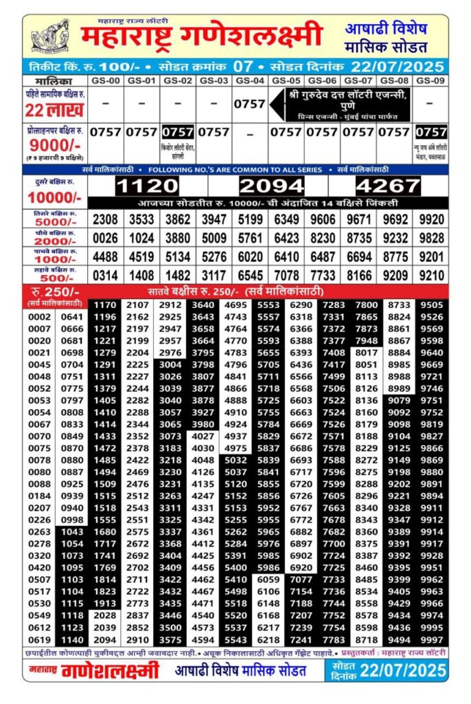 Maharashtra State Ganesh Laxmi Ashadhi Monthly Lottery Results 22/07/2025: Click Here