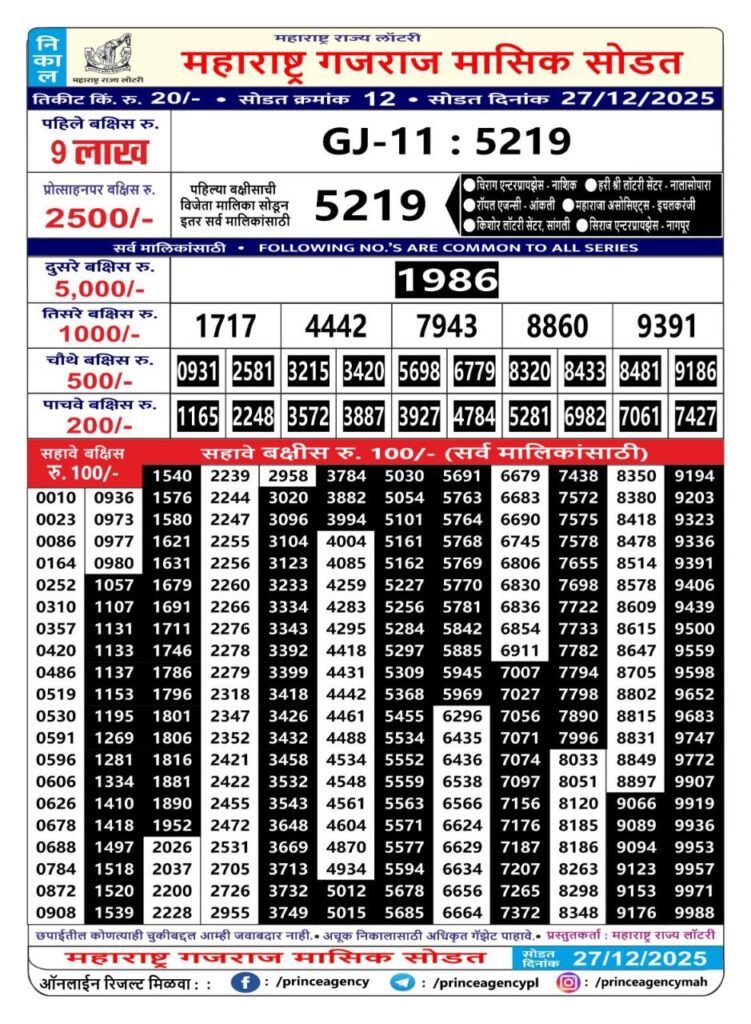 Gajraj Monthly Lottery Draw Results Wednesday, 27 December 2025: Prize Scheme Summary