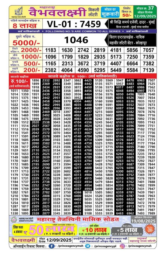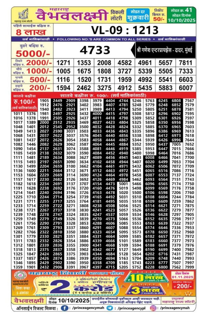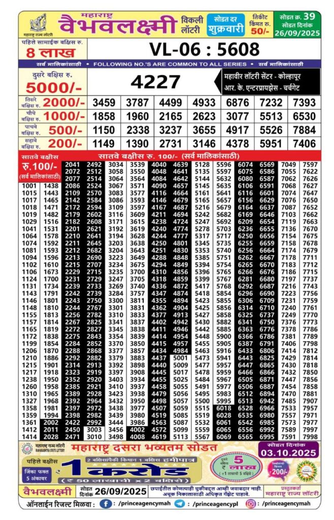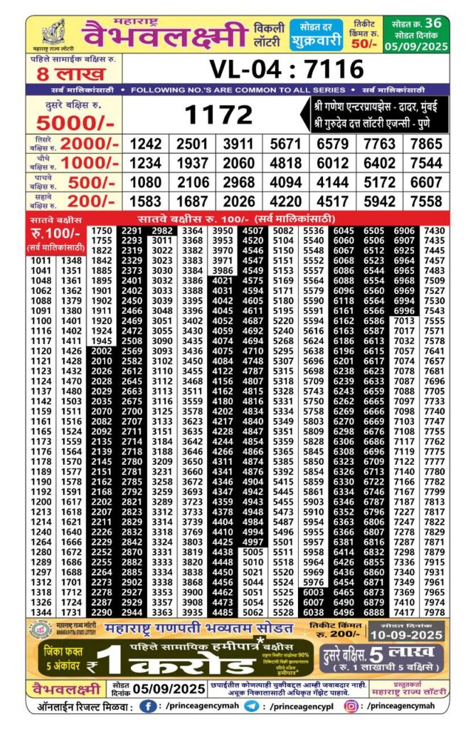 Maharashtra Vaibhav Laxmi Lottery Result & Winner List of 2025. Enjoy your Day today Friday with Maharashtra Vaibhav Laxmi Lottery Results. Maharashtra State Lotteries Board gives you many chances to change your Lifestyle in Your Way. all the Lottery Draws of Maharashtra State not only help you but also generate employment opportunities in the State. You too can do your bit in improving the Economy by Giving a shot at any Scheme.