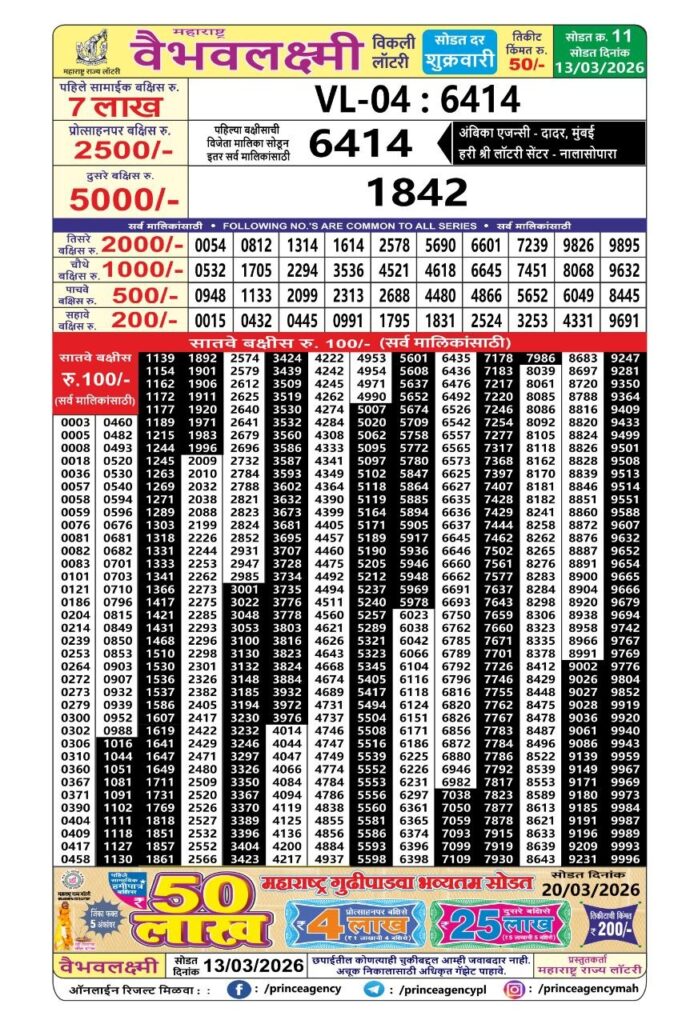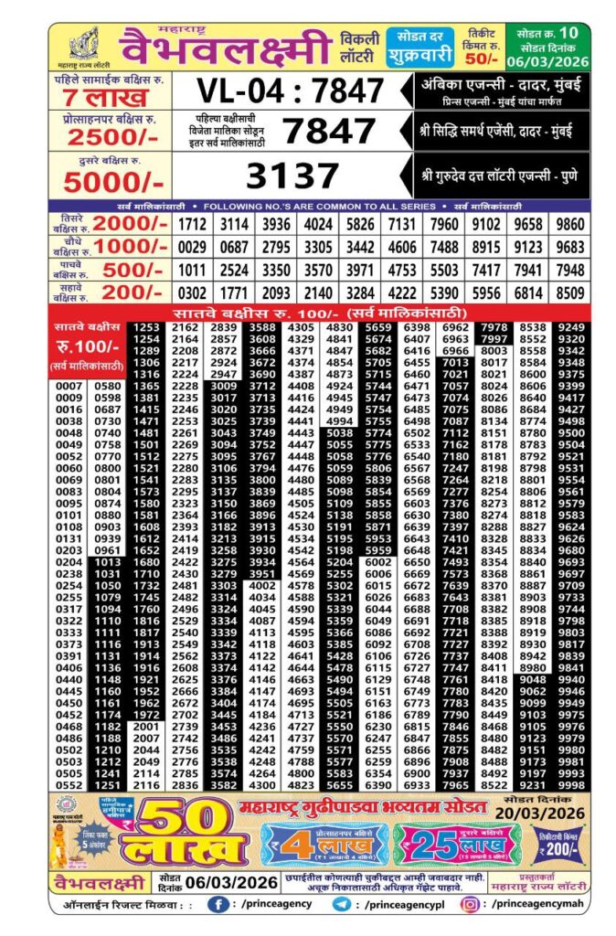 Maharashtra Vaibhav Laxmi Lottery Result & Winner List of 2025. Enjoy your Day today Friday with Maharashtra Vaibhav Laxmi Lottery Results. Maharashtra State Lotteries Board gives you many chances to change your Lifestyle in Your Way. all the Lottery Draws of Maharashtra State not only help you but also generate employment opportunities in the State. You too can do your bit in improving the Economy by Giving a shot at any Scheme.