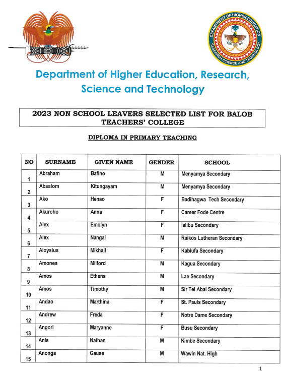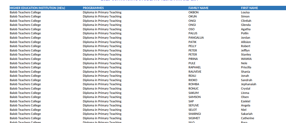 Balob Teachers College Non School leavers List 2023: Click Here