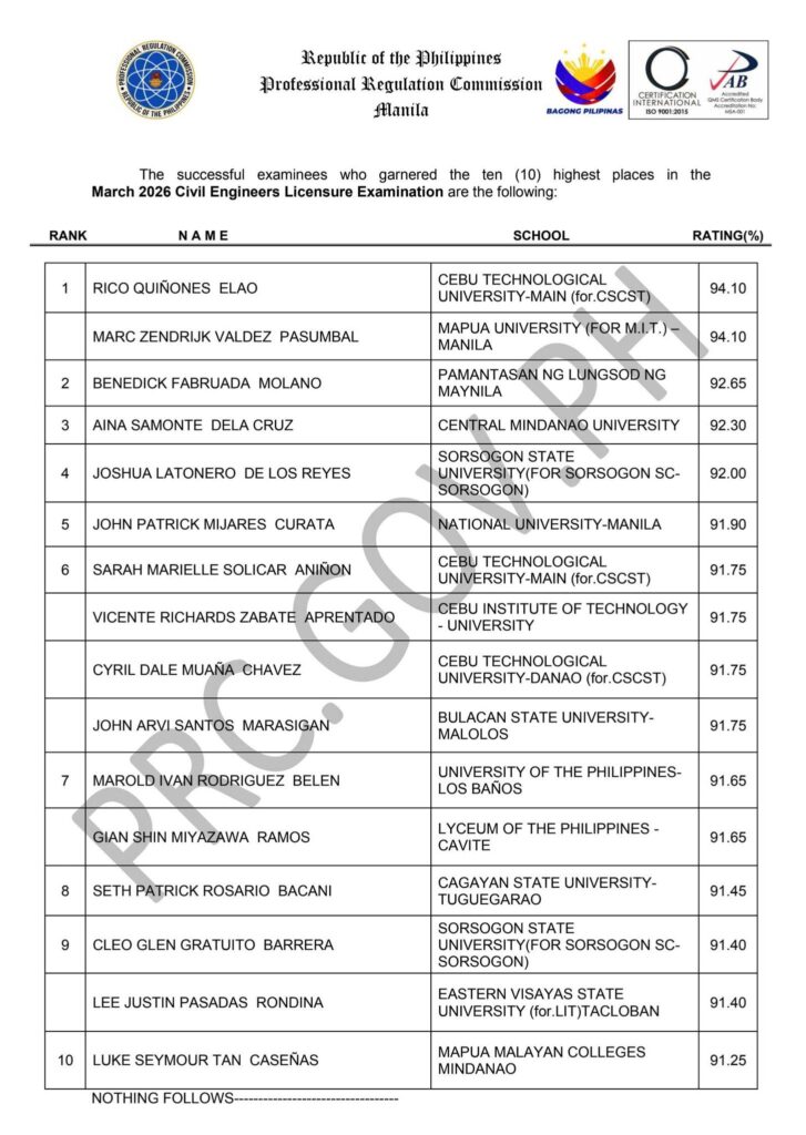 ” The Professional Regulation Commission (PRC) announces that 6,438 out of 18,370 passed the Civil Engineers Licensure Examination given by the Board of Civil Engineering in 19 testing centers all over the Philippines last March 2026″.