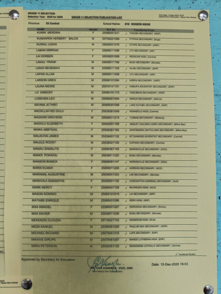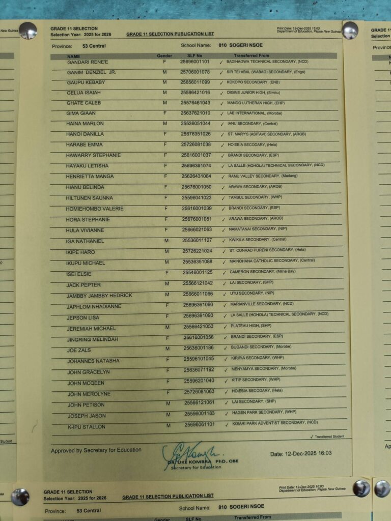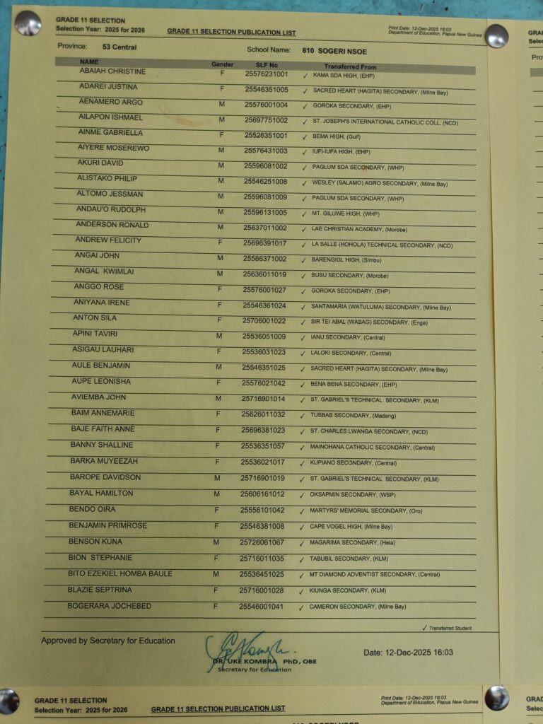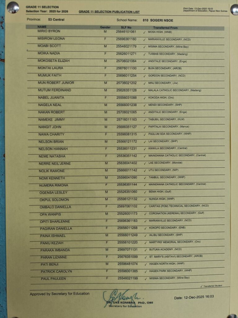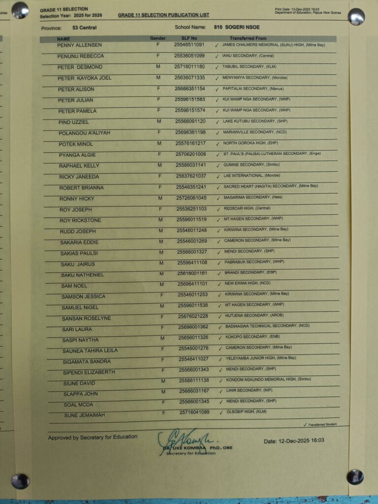 Grade 11 Selection List for 2026 Sogeri NSOE
