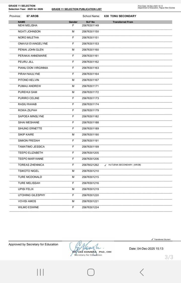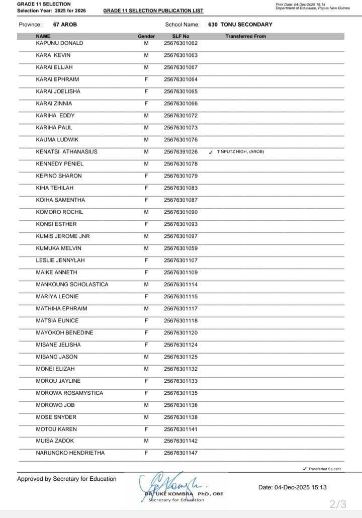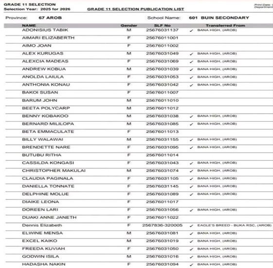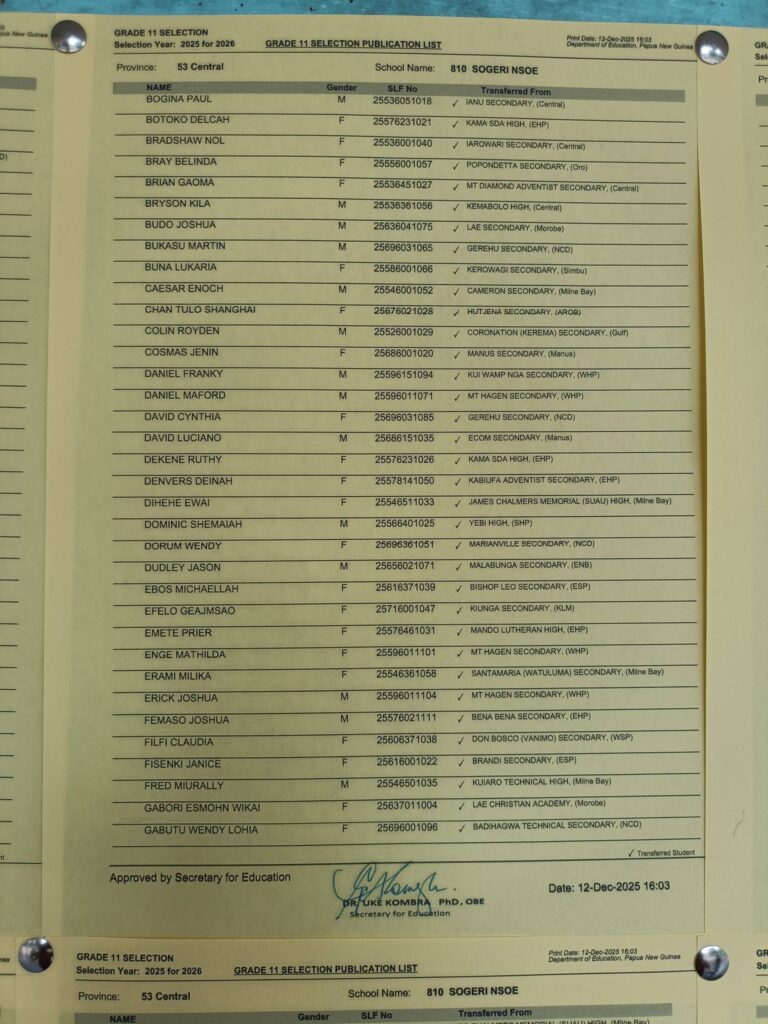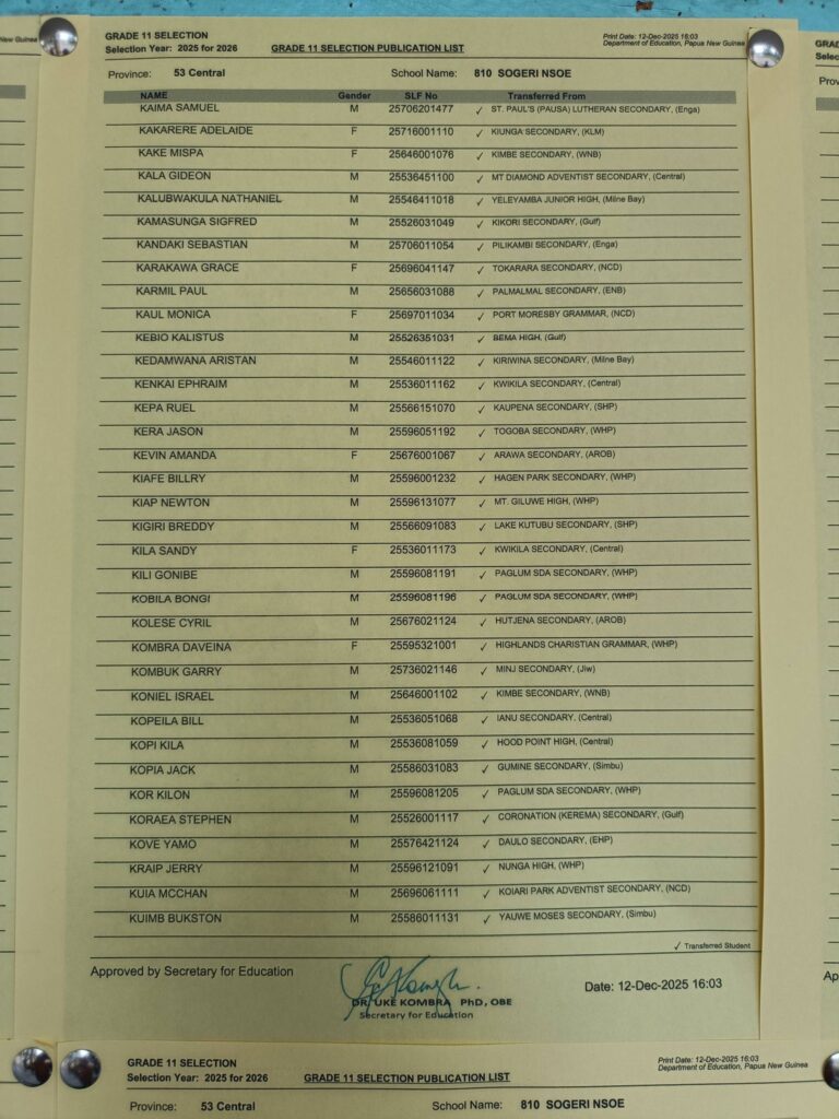 Grade 11 Selection List for 2026 Sogeri NSOE