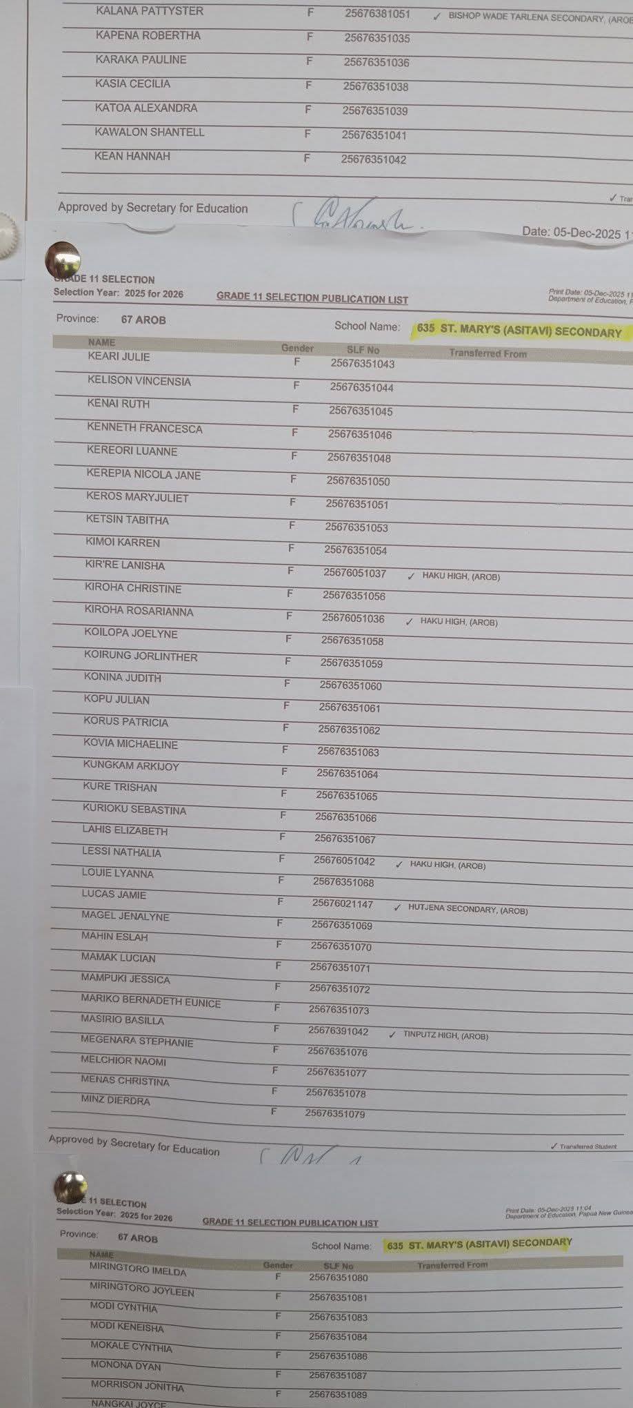 Grade 11 Selection Publication list for 2025 to 2026 ST. Mary’s (Asitavi) Secondary School