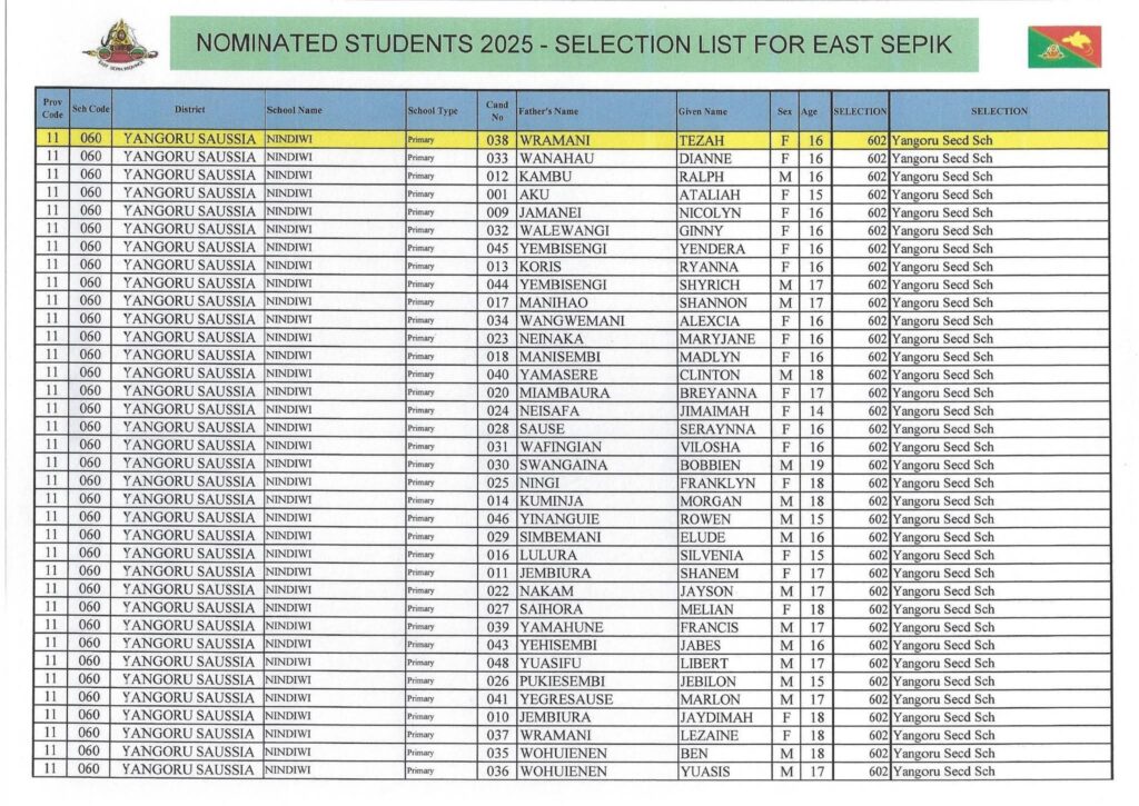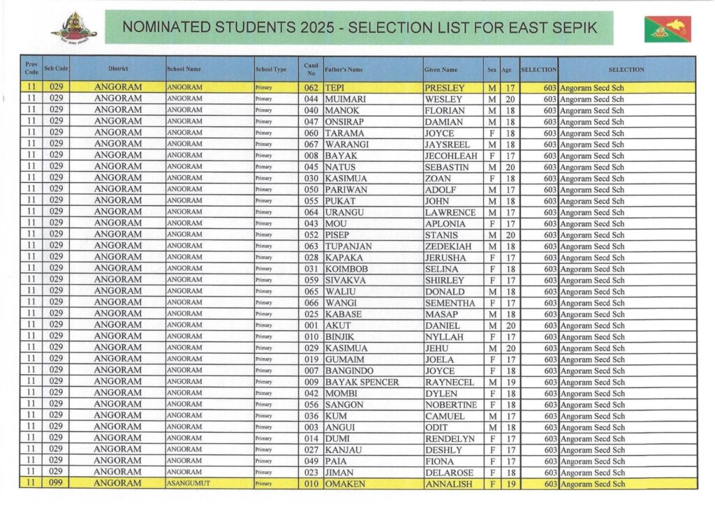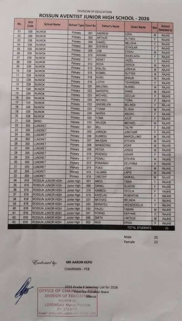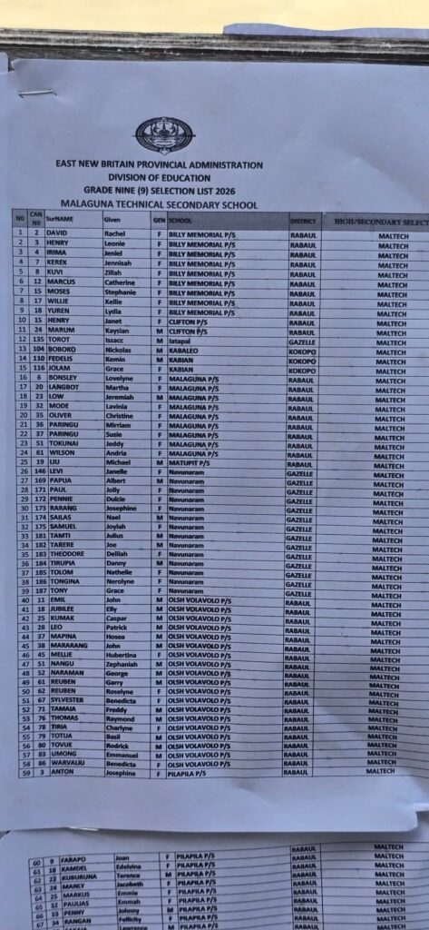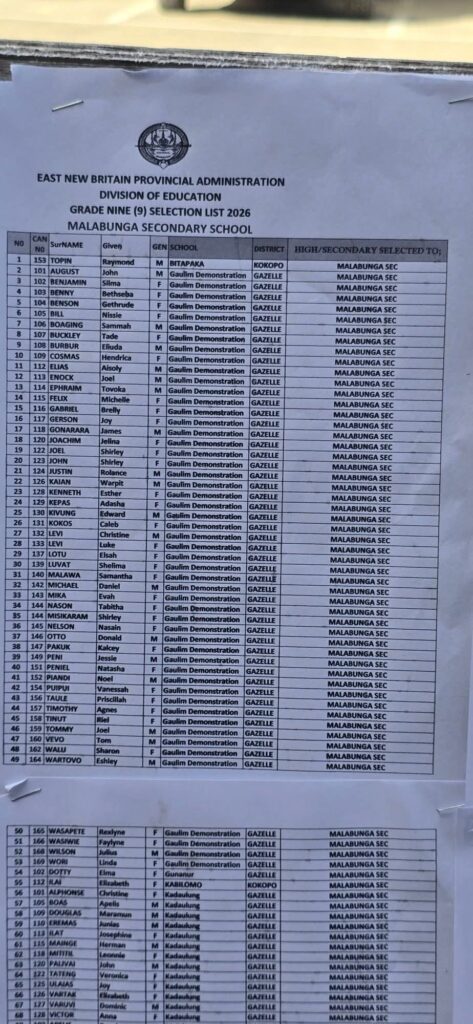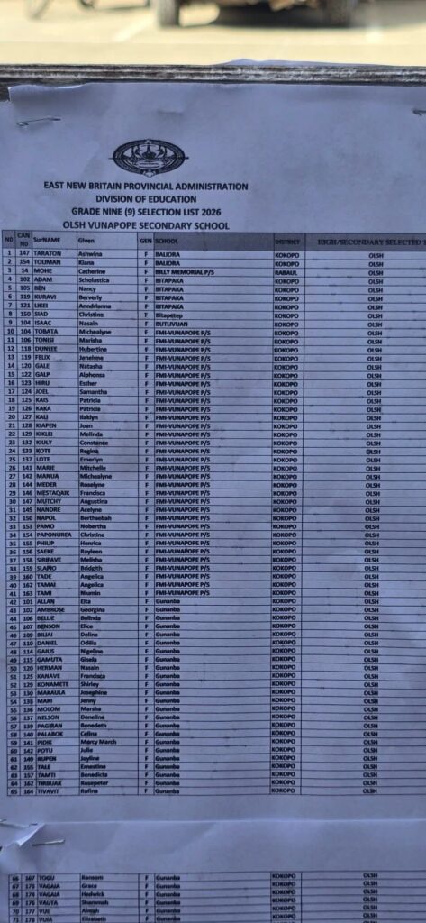 Papua New Guinea 2025 Grade 9 Selection list for 2026 Pdf Download