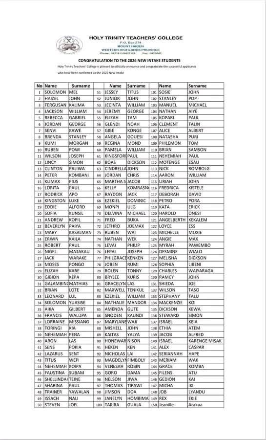 | Holy Trinity Teachers College Selection List 2026 | Click Here |