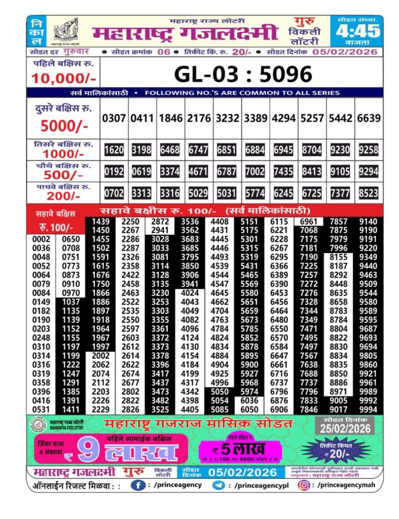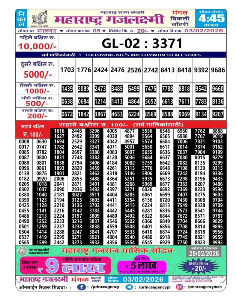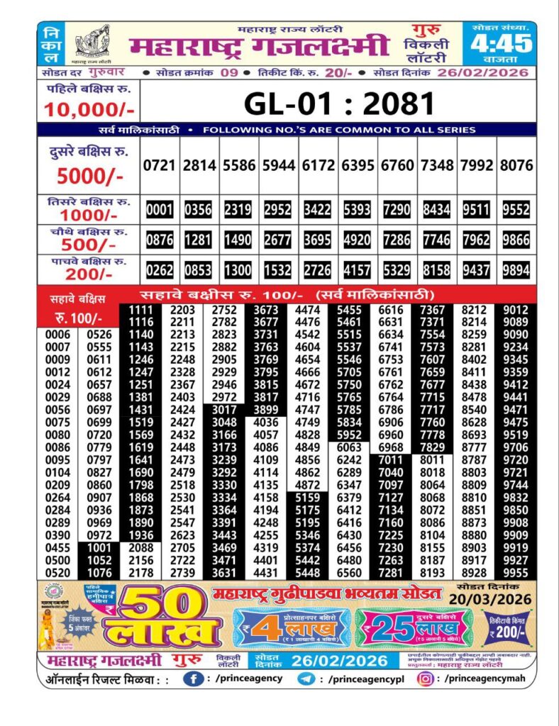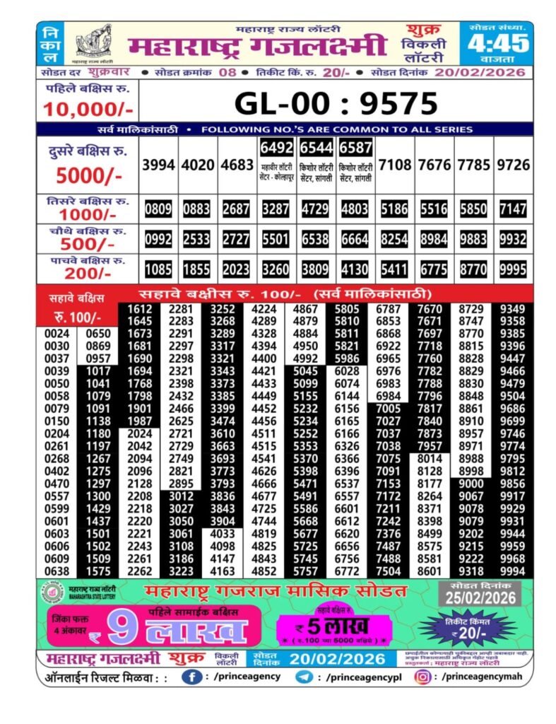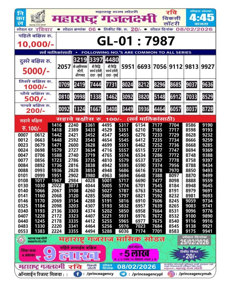 If the the goal is clear, then making its way through the Maharashtra State Gajlaxmi Lottery Today result would be the Right option. You hold the key to Your Bright Future, and Lottery Draws are the Kinks. Directorate of Maharashtra Rajya Lotteries continues to announce the Gajlaxmi Weekly Lottery 2026 results at 04:45 PM. A large number of Lottery Opponents Believed Lotteries from Different Lottery Centers. The State Government started the Lottery to encourage people to participate and earn Extra Cash. So, with Constant Encouragement and cheap lottery tickets, more and more people are trying their luck in Maharashtra State Lotteries.