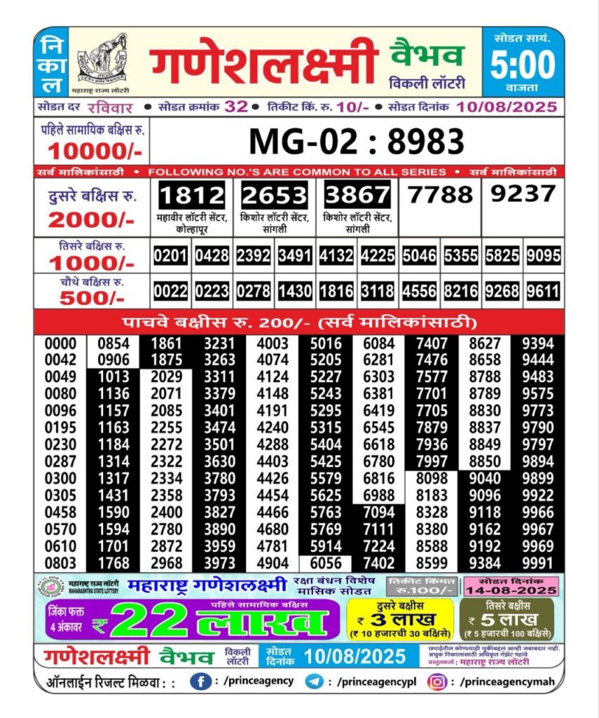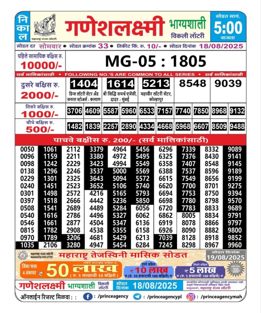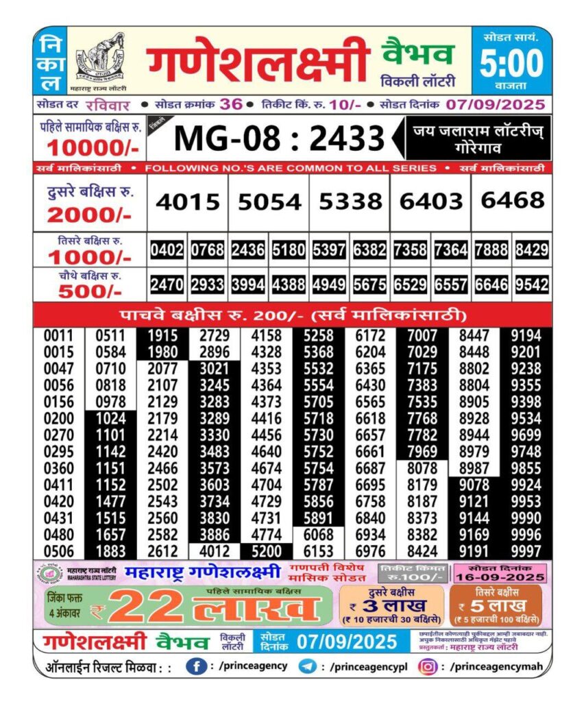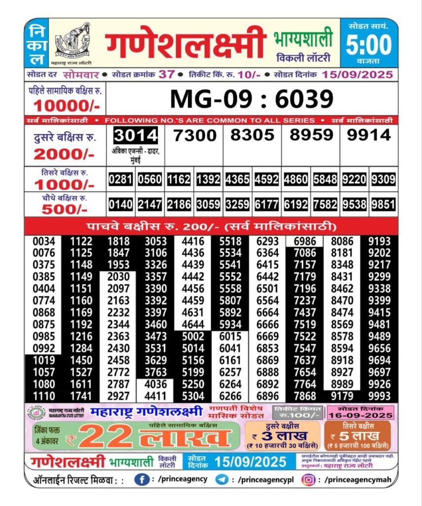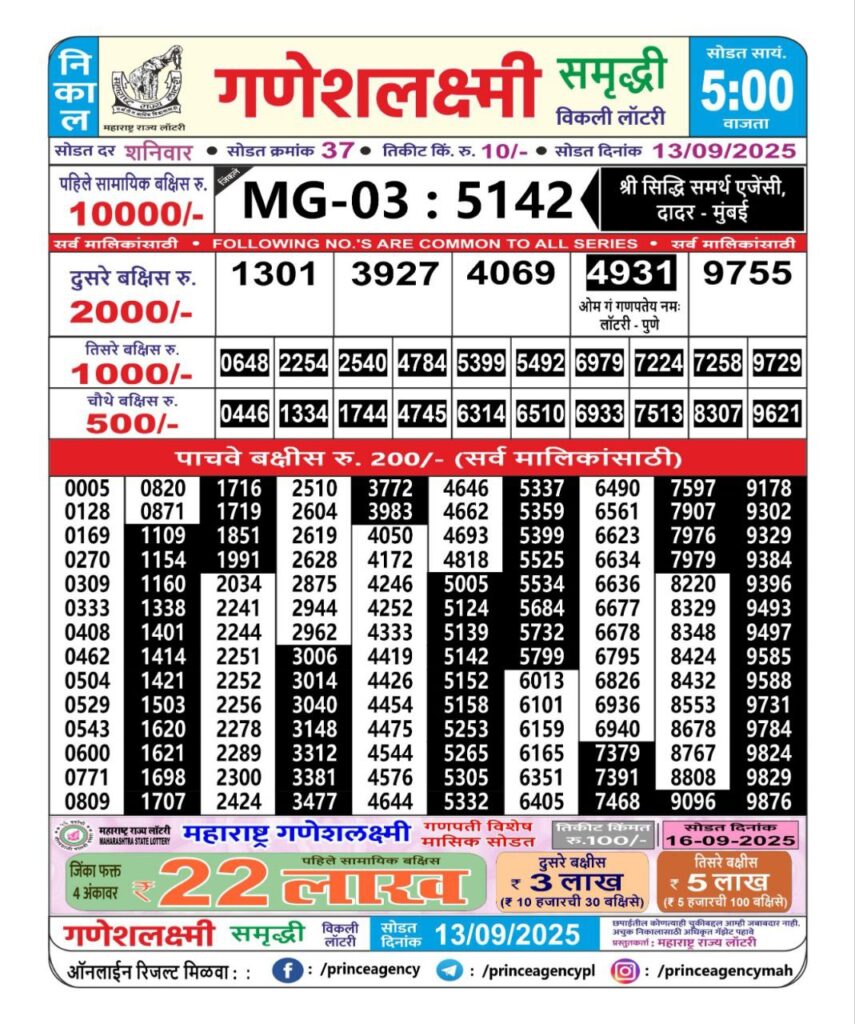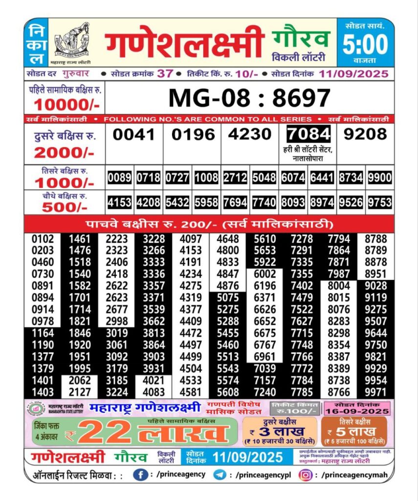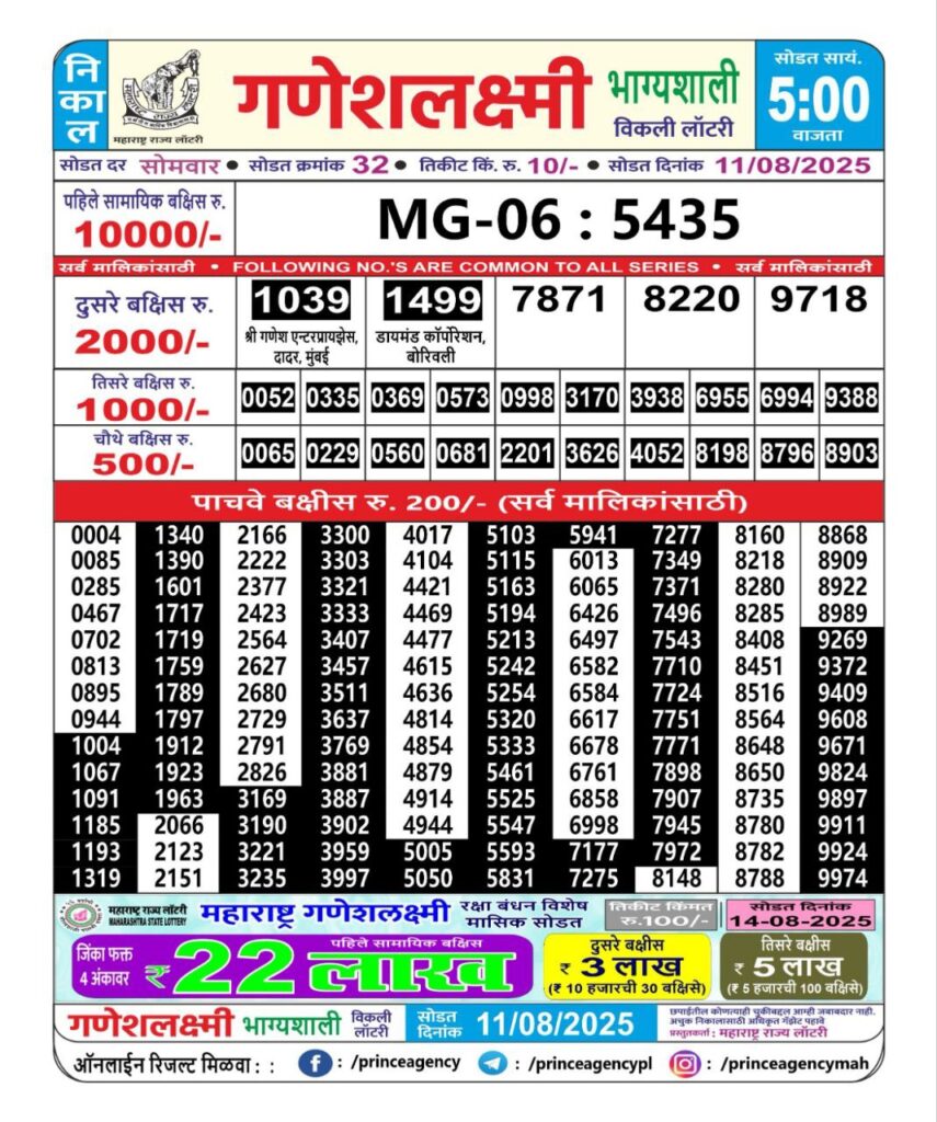 8 thoughts on “(5:00 PM)Maharashtra Ganesh Laxmi Lottery Results 2025-Today| 1st 2nd 3rd 4th & 5th Victors