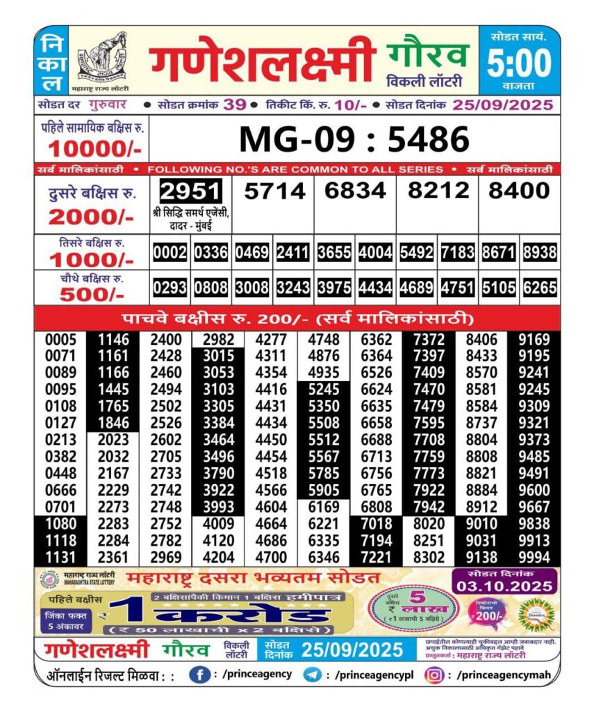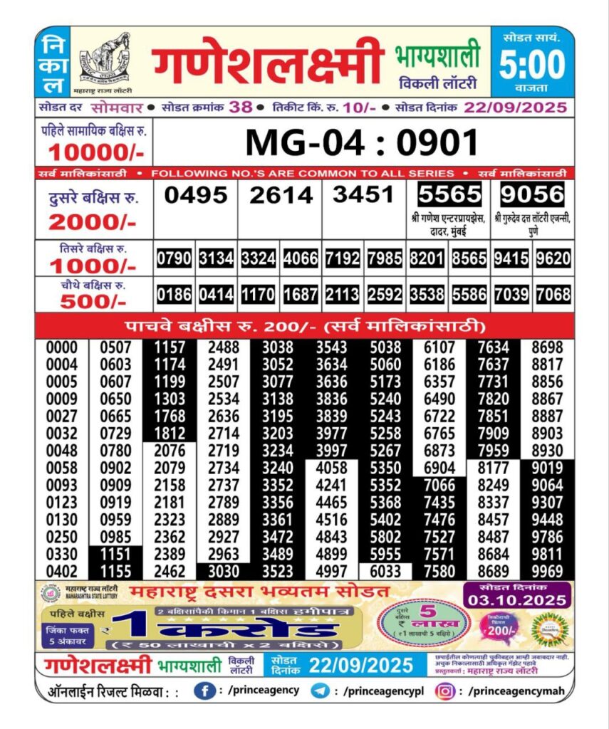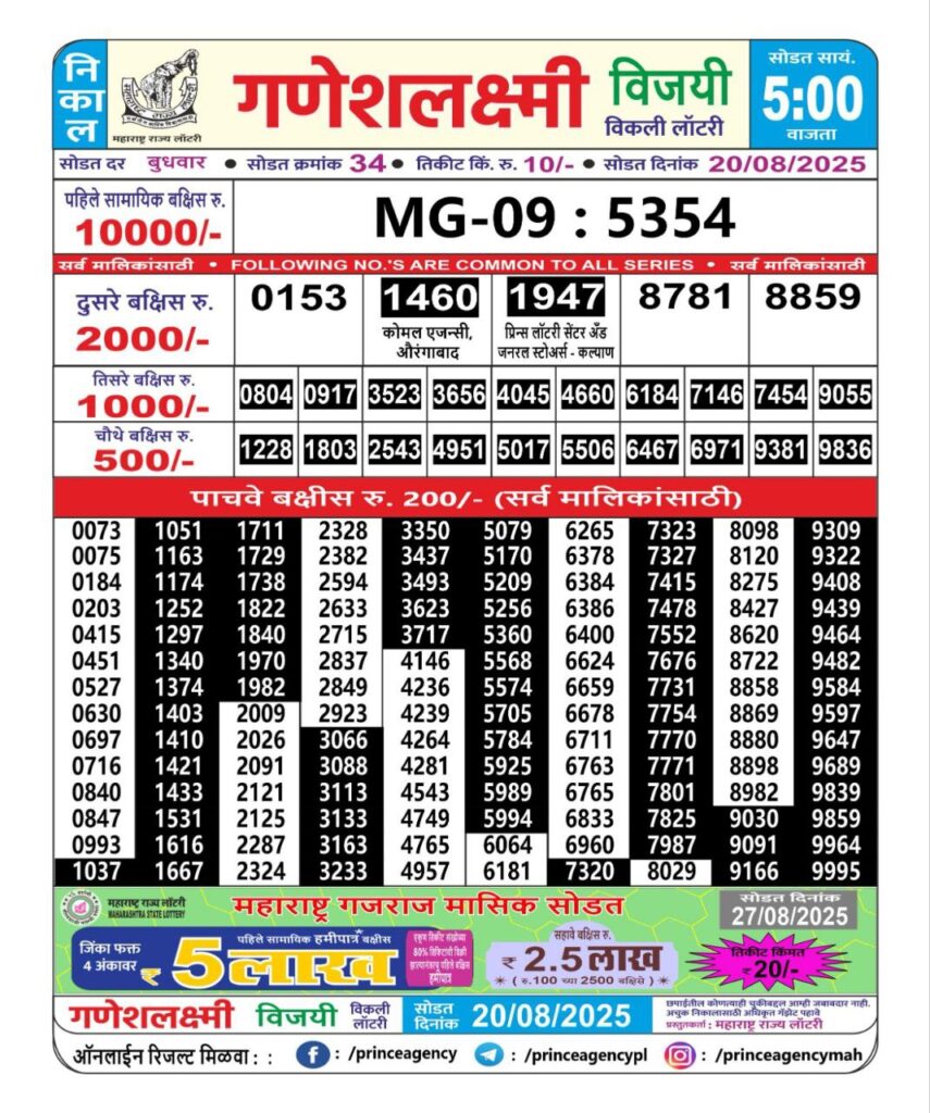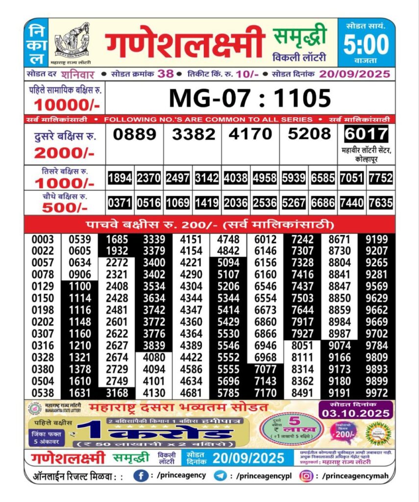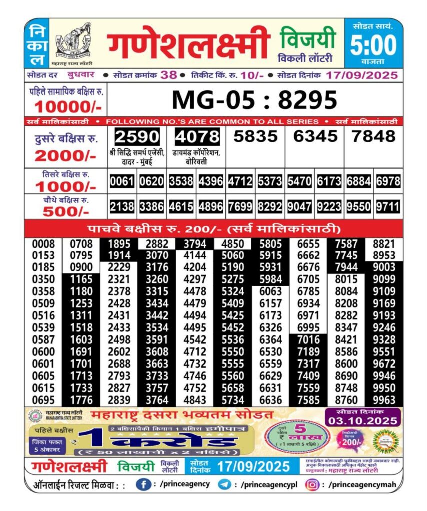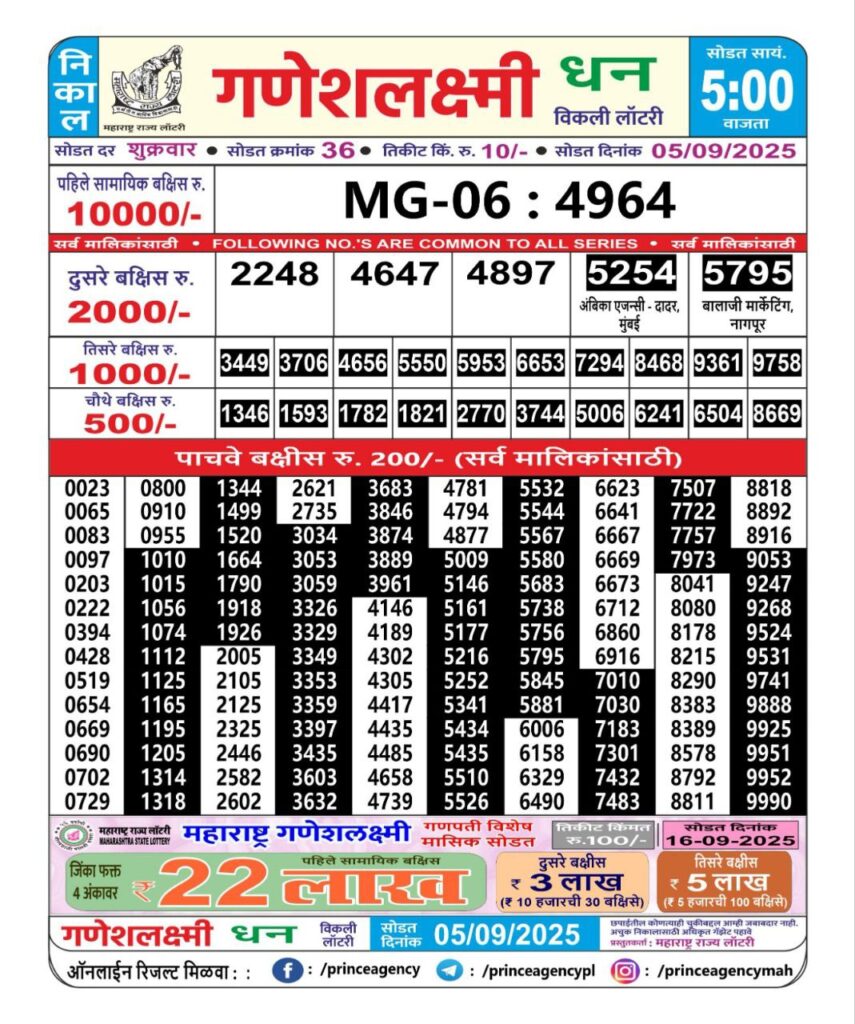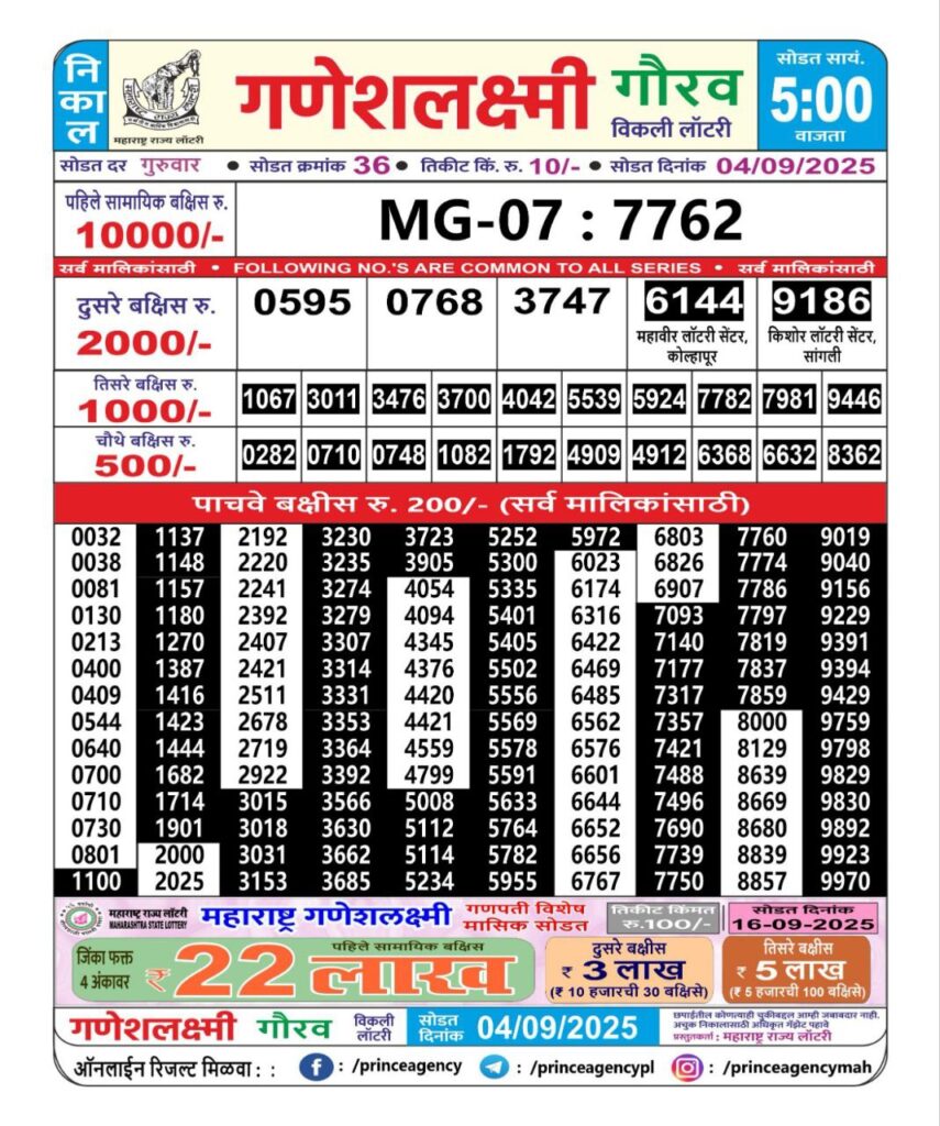 OCTOBER 2025 Alert: Maharashtra Ganesh Laxmi Weekly Lottery Results 2025 Will be Declared Daily At 05:00 PM. Stay in Touch With Us.