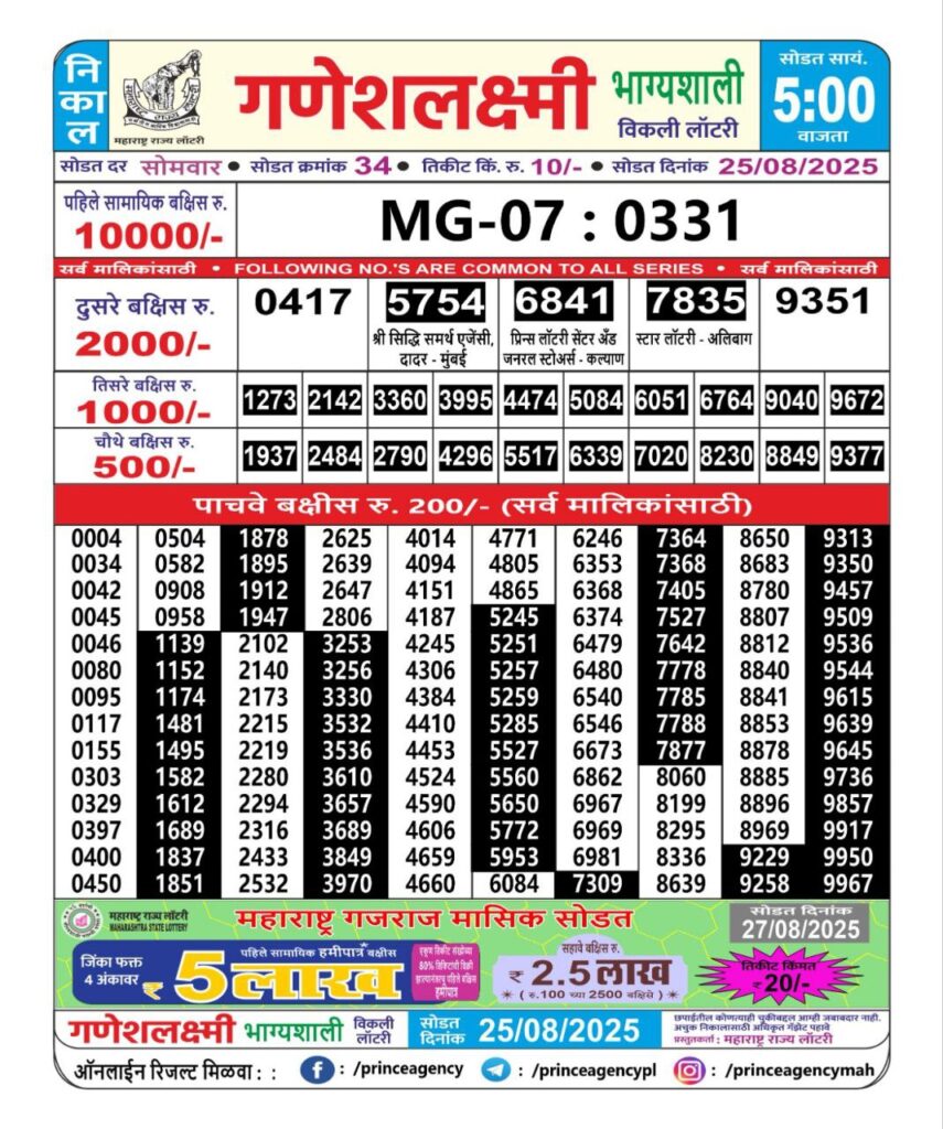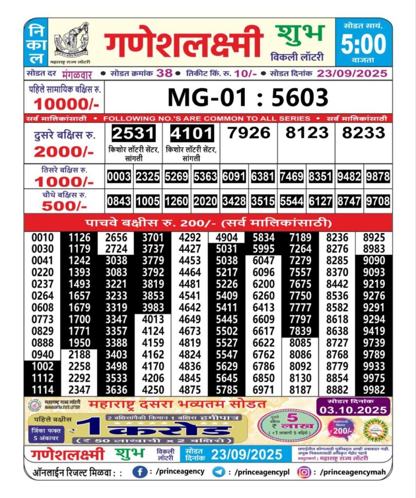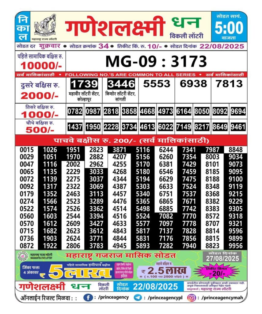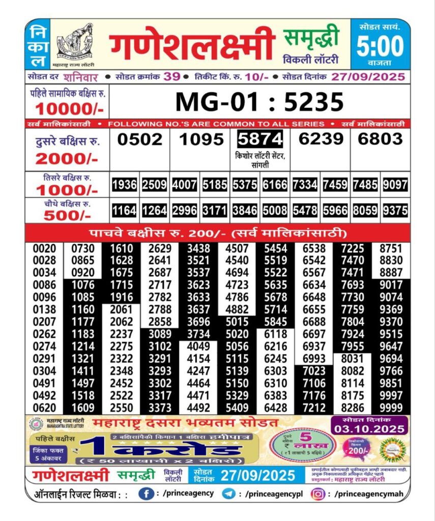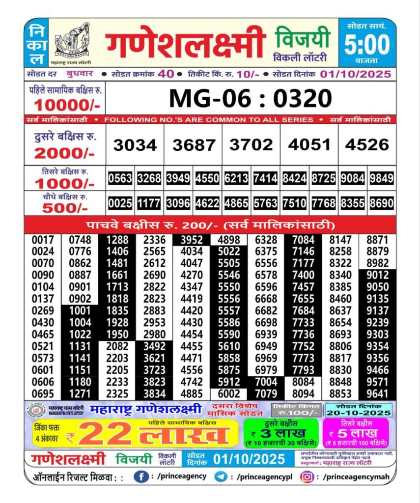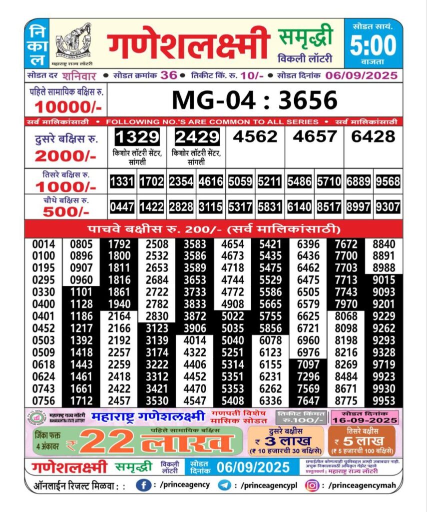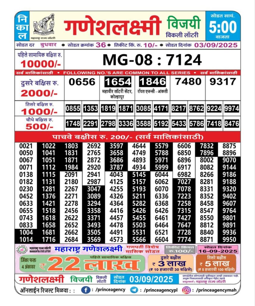 OCTOBER 2025 Alert: Maharashtra Ganesh Laxmi Weekly Lottery Results 2025 Will be Declared Daily At 05:00 PM. Stay in Touch With Us.