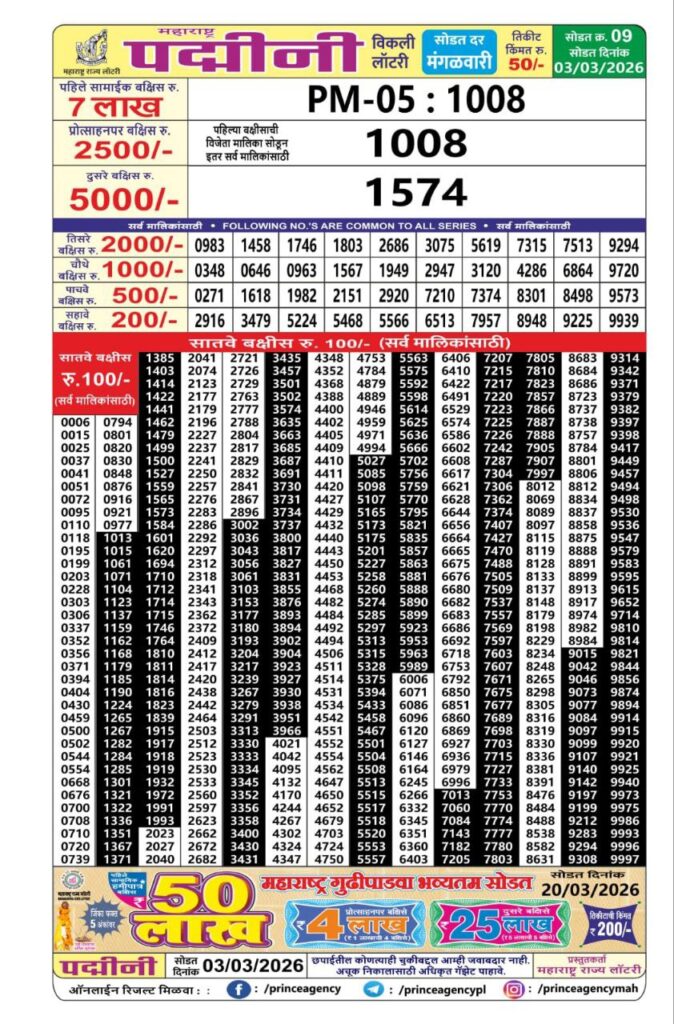 Alert On Tuesday 4.15.PM: Maharashtra State Lotteries released the Padmini weekly Lottery Results Today at 4.15 PM. Stay and connected with this page regularly.