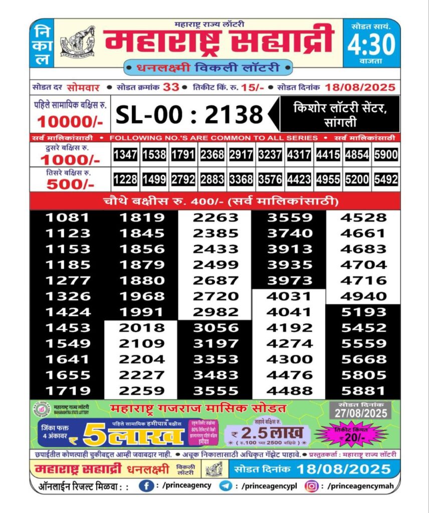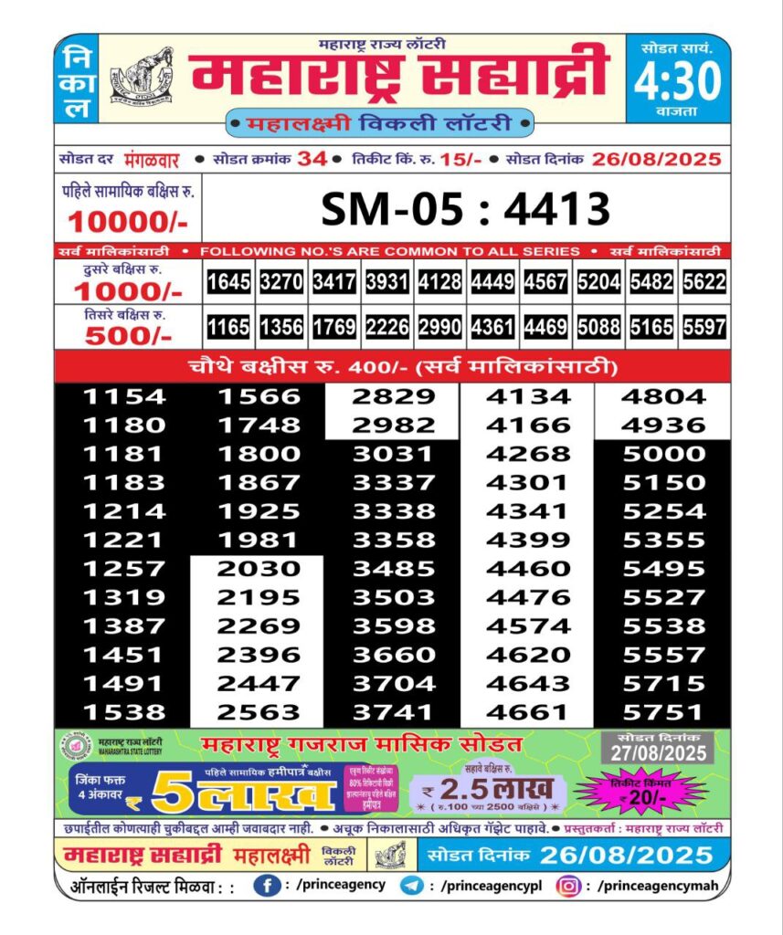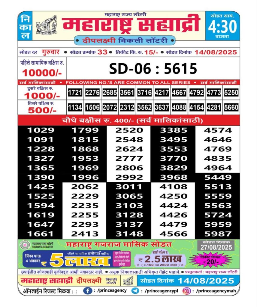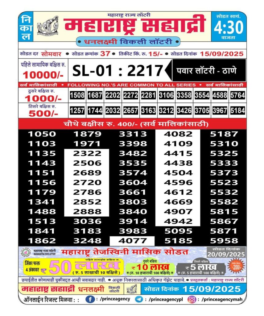 महाराष्ट्र सह्याद्री साप्ताहिक ड्रा Results 2025 – दररोज Maharashtra Lottery Today