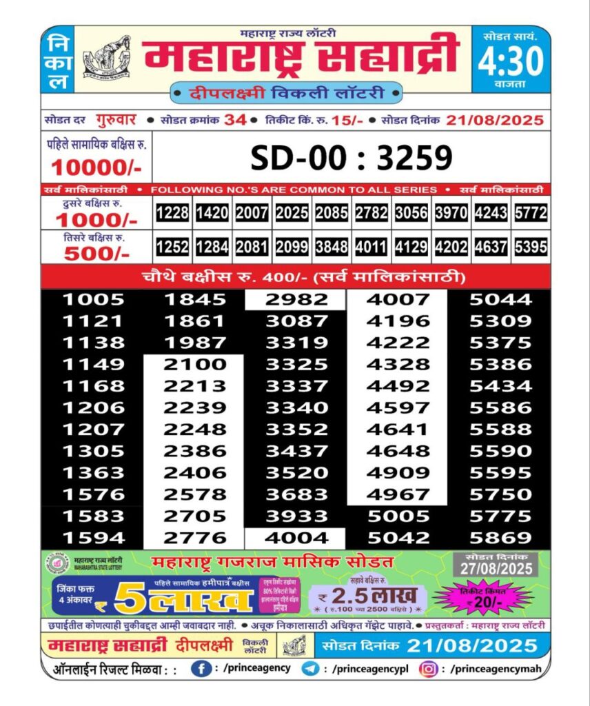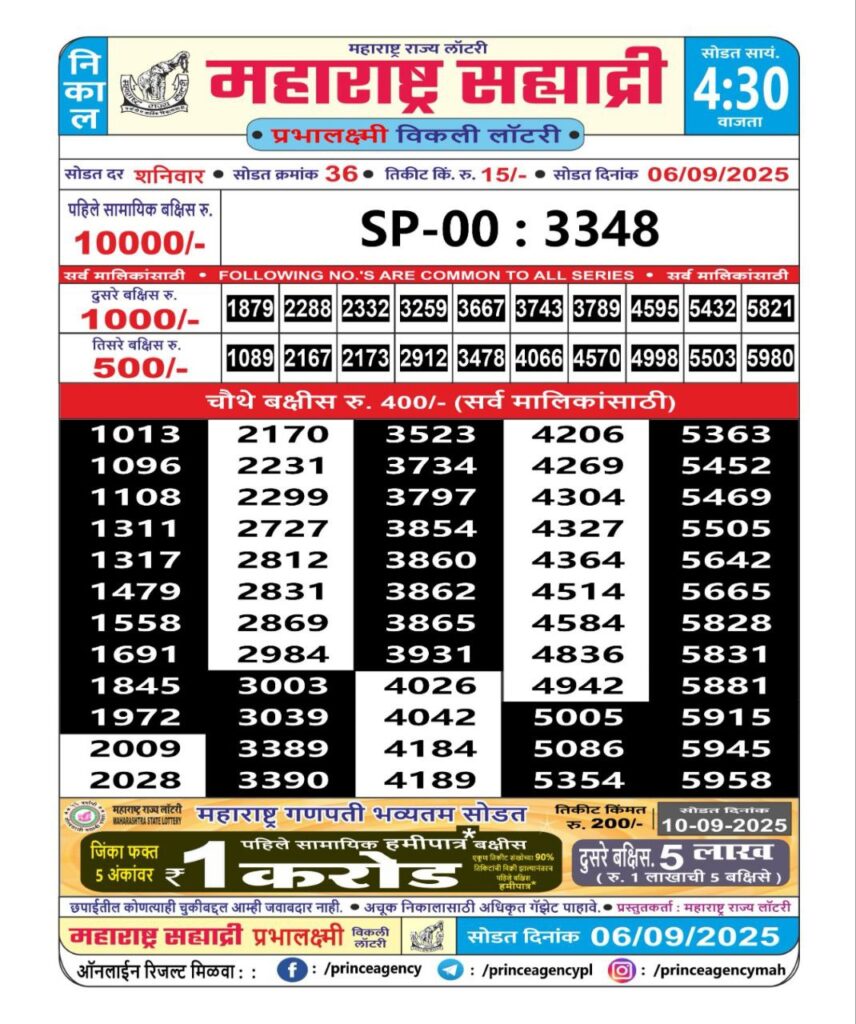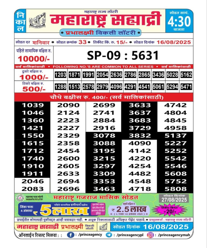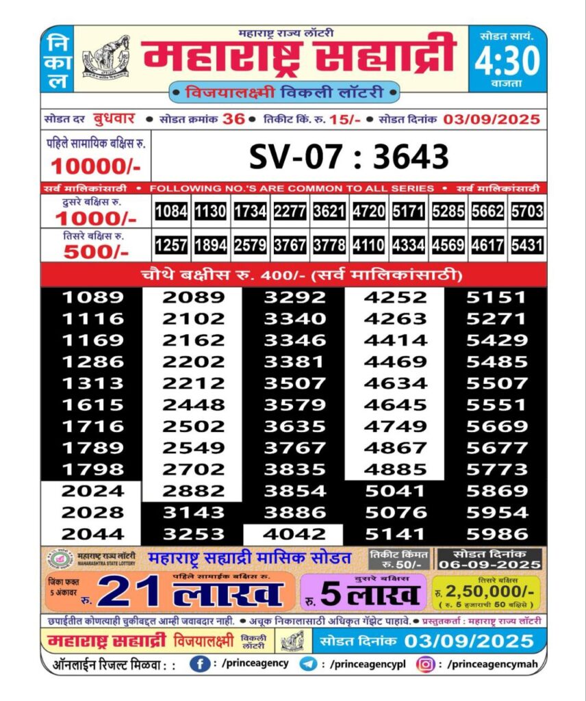 Lottery Name | Maharashtra Sahyadri Weekly Draw Results 2025 |