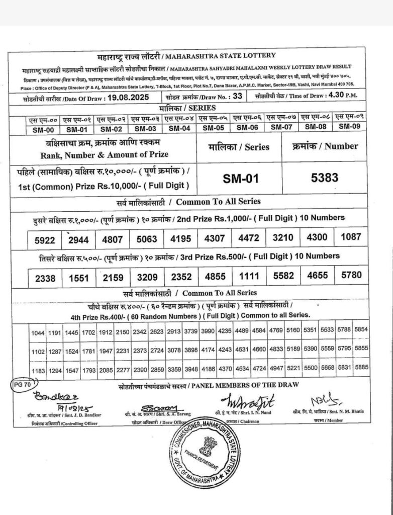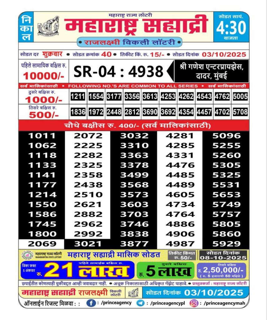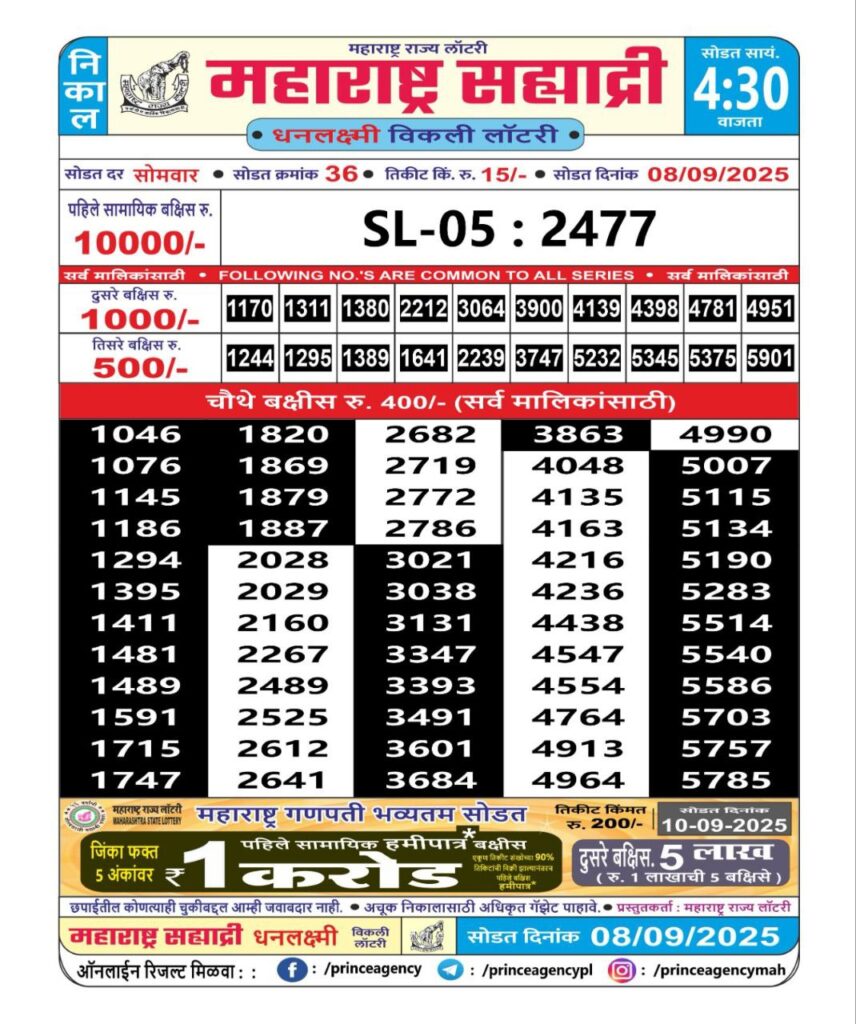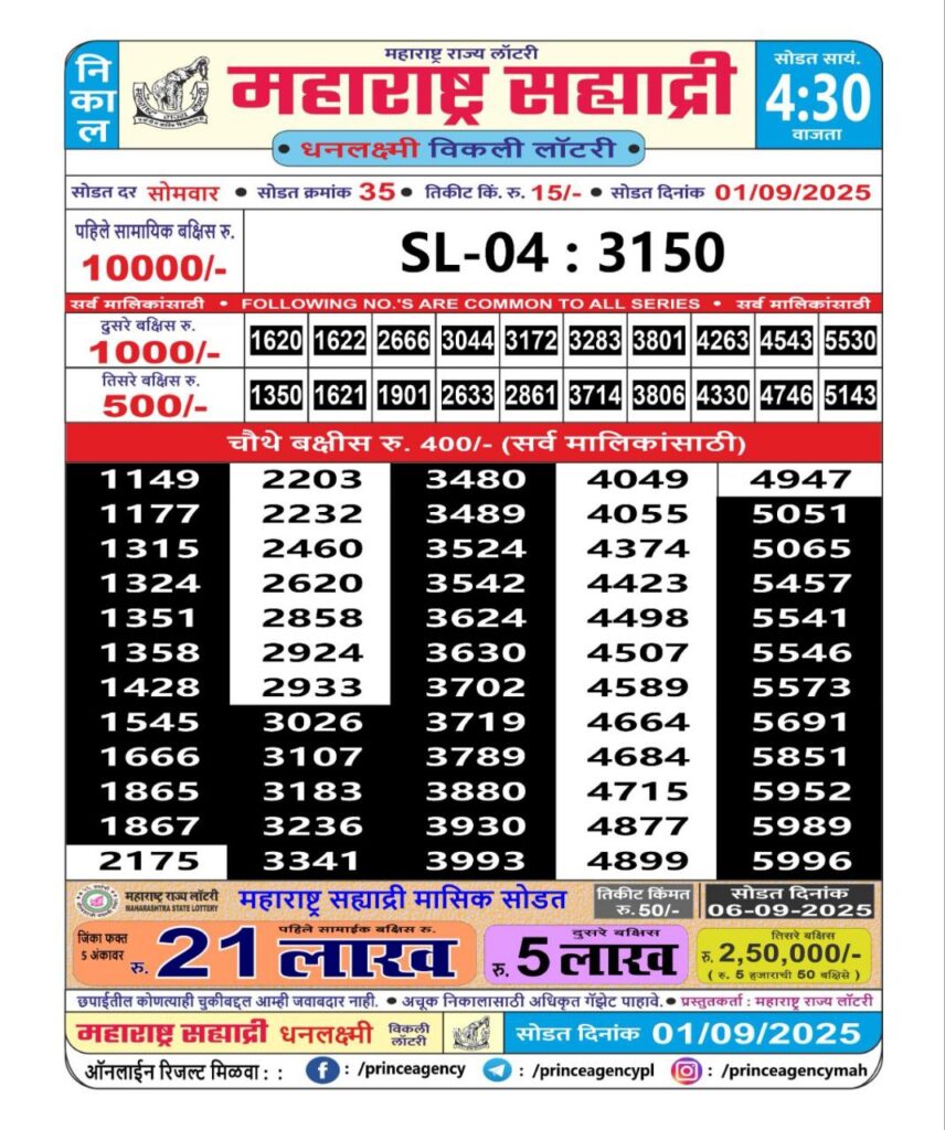 Lottery Name | Maharashtra Sahyadri Weekly Draw Results 2025 |