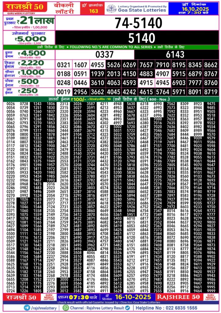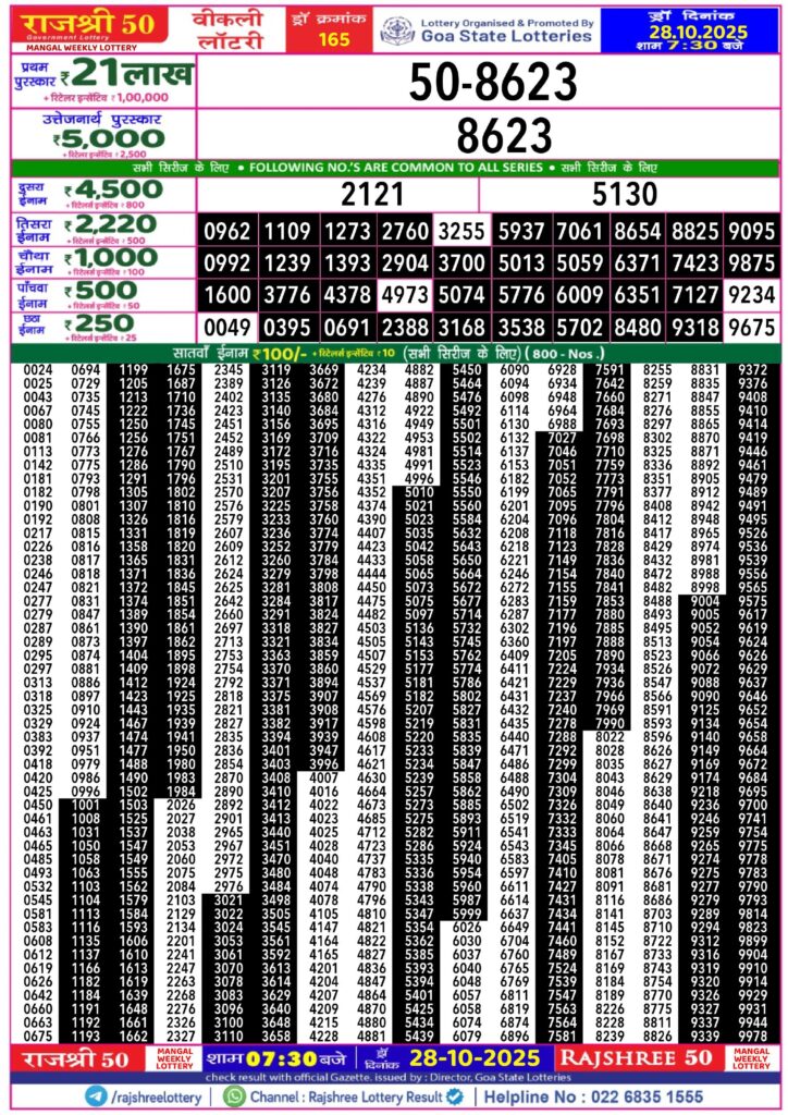 One thought on “Goa Rajshree 50 Weekly Lottery Results 2025 @7.30pm| 1st Prize Rs.21 Lakhs/- Daily Prize Conquerors