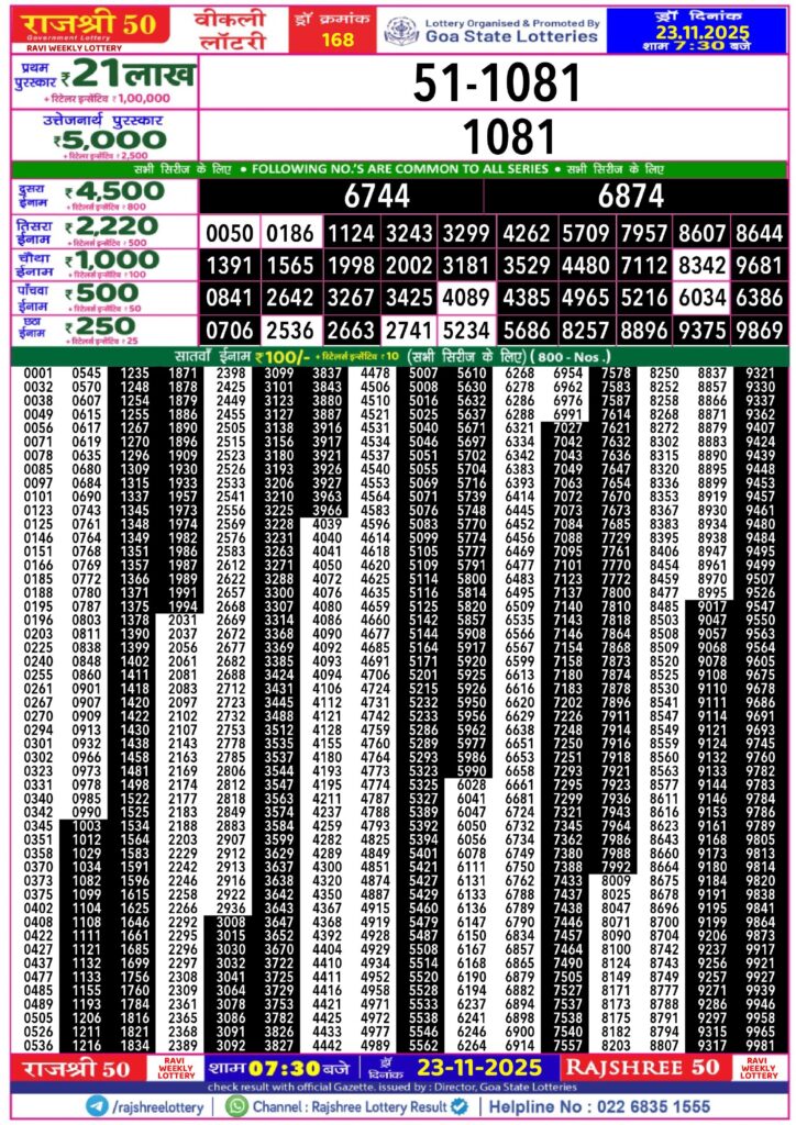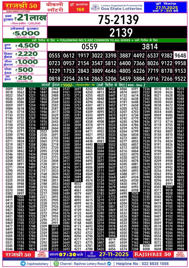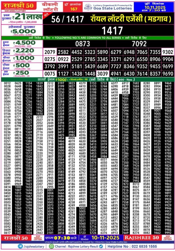 Daily Alert November 2025 @07:30 PM: Goa State Rajshree Lottery Results 2025 Declared for Rajshree 50 Weekly Lottery Winner List.