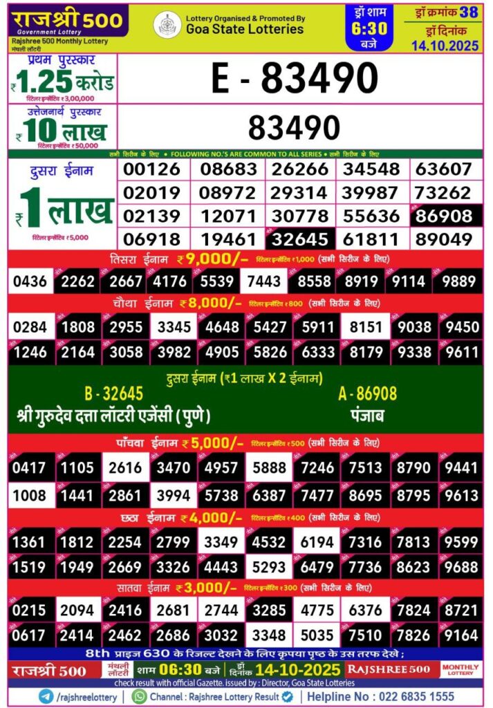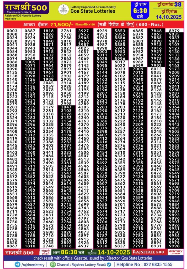 GOA ਰਾਜਸ਼੍ਰੀ 500 ਮਾਸਿਕ ਲਾਟਰੀ Results 14th October 14/10/2025: Click Here
