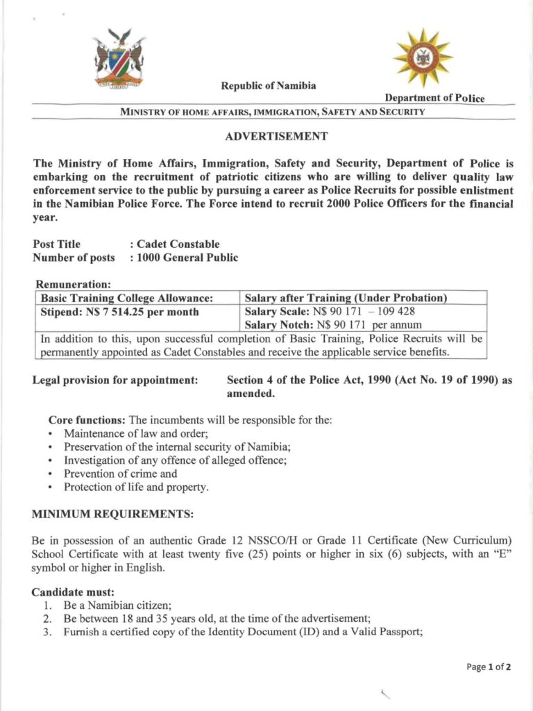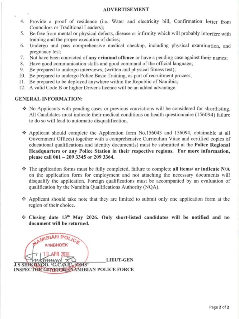 This is to inform that the Namepol Recruitment 2026 for Cadet Constable is scheduled to commence from 13th April 2026 to 13th May 2026. The list of Successful Applicants to be Interviewed for the Positions of Cadet Constable is will be released on the Nampol Website nampol.gov.na. and at all Police Regional headquarters.