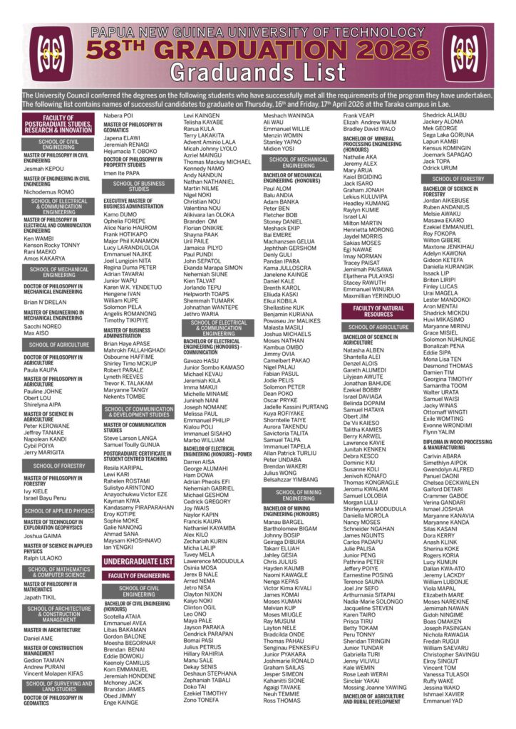 The PNG University of Technology 58th Graduation ceremony will be conducted over two days on Thursday, 16th, and Friday, 17th April 2026. Graduands, parents/guardians, and sponsors are to note the faculties will be graduating per the details below.