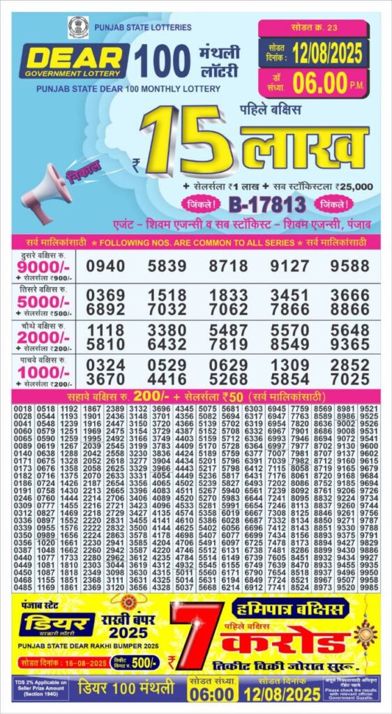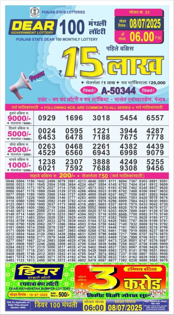 Positive hope and Punjab State 100 monthly Lottery Result is wht needed to make your future bright. Now is the time to think about the biggest goal of your life and fulfill them with Punjab lotteries. If the Destination is clear, then making way through Punjab State Lottery today result would be the right choice. as they say difficult roads lead to a beautiful Destination. Punjab State Lottery is back with one another lottery results. Today we bring to you Punjab Dear 100 monthly Lottery result on 14th October 2025. also, the results will be announced at 6pm. Dear 100 Monthly Lottery Results on Tuesday may change your life forever. The whole universe is devising to make you win and Rich. Who knows you could be the next millionaire in line. One needs to at least try for it before the fortune shows its blessings. The much-awaited results will be Published on Tuesday, 2025, when you can get lucky. Don’t miss out on a chance to win a prize worth Rs 15 Lakhs/-.