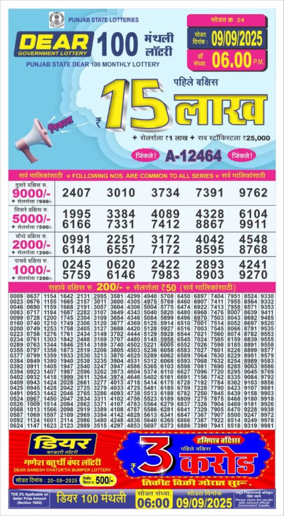 Luckiness Favors those who take the Brilliance of their dreams and dare to try for it. Partaking in Punjab State lotteries is simple, you have a chance to win a jackpot worth Rs.15 Lakhs/-. Purchase a ticket with a predefined serial number and you are Fine to go. Wait for the thrilling Punjab State Dear 100 Monthly Lottery 9th September, 14-10-2025 PDF Winner List showcases full ticket winning numbers. Although the live result is available at 6:00 PM On the Official Gazette.