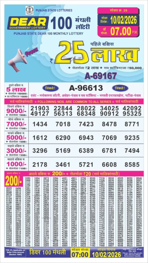 Attention On February 10, 2026: Punjab State Lotteries Publishes the PUNJAB Dear 100 Monthly Lottery Live-Draw Today 10-02-2026 will be Published at 7pm. Stay Connected Here on this Page.
