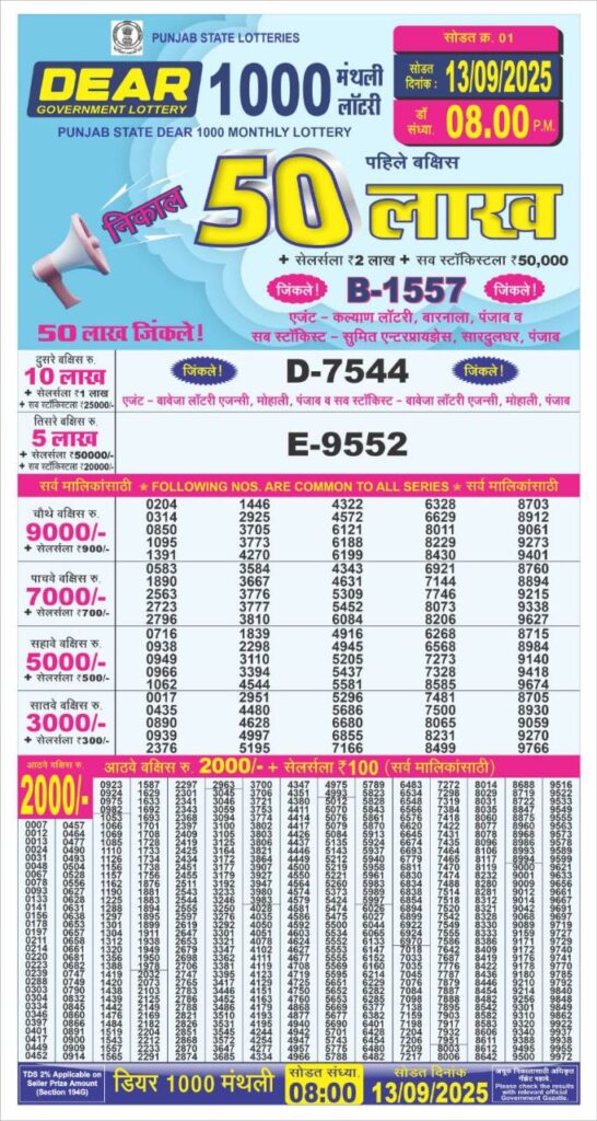 Have a Blessed day to All! Punjab State Lotteries Dear 1000 Monthly Lottery Results for 50 lakh prize money will be released on 13-09-2025. One of the thrilling news to all Punjab Lottery participants. Today we bring you to Punjab State 1000 monthly result at 8.30pm. Get ready to rock your weekend with the Punjab Dear 1000 monthly lottery draw result 2025. It is never too late to be what you might have been, have you tried your luck in Punjab state lottery yet? now is the moment to check the much awaited winning lit of Dear 1000 Punjab lottery results 13 September 2025.